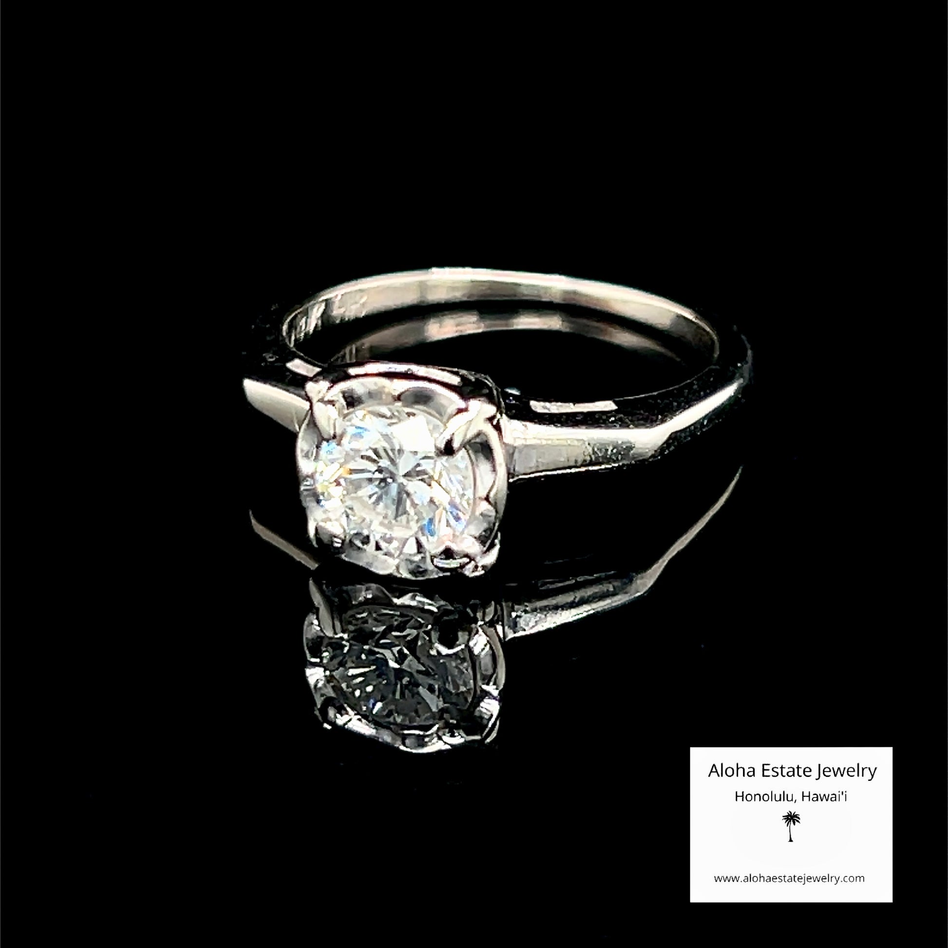 At its heart rests a half-carat diamond solitaire in all 14k white gold, held by four prongs and estimated at VS clarity. Carrying the faintest trace of warmth at the J-K boundary, the diamond in its setting is distinctive with its 7mm x 7mm face — radiant, balanced, and unmistakably of its time.