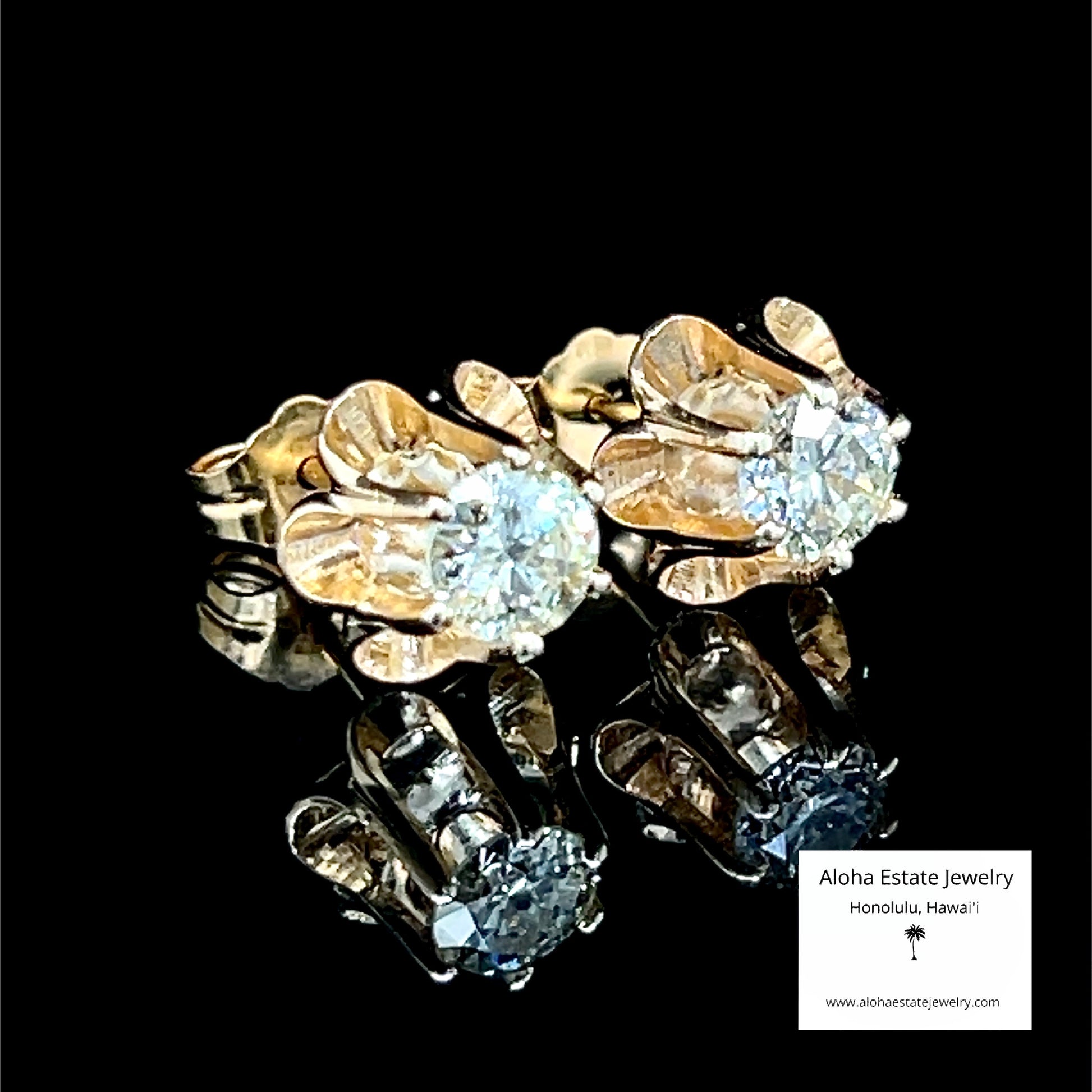Elegant and luminous, these vintage diamond studs feature two brilliant round diamonds totaling 1.00-carat, each 0.50carat, nestled in warm 14k yellow gold buttercup settings.