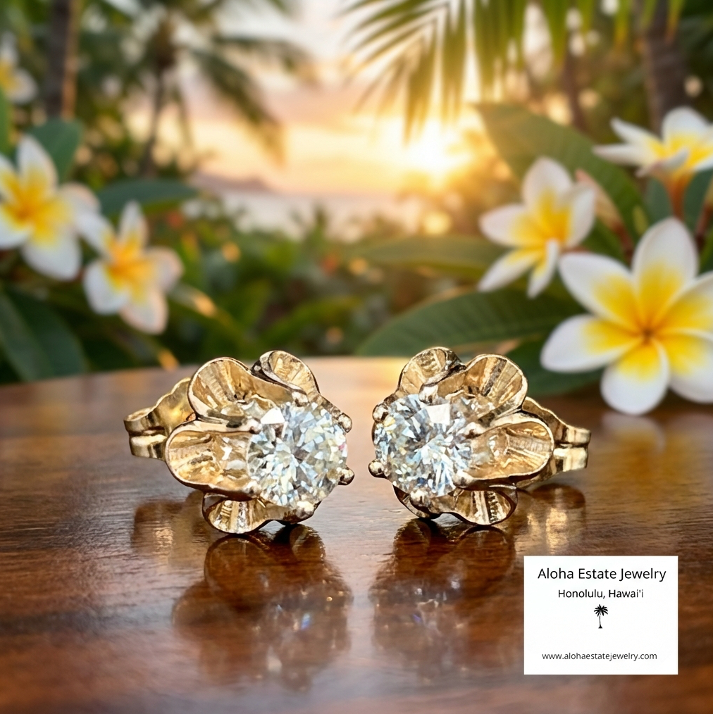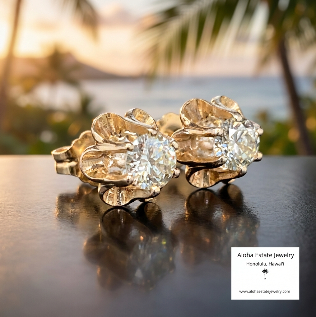 The signature mid-century buttercup design elevates each stone on a delicate scalloped gallery, maximizing light refraction for exceptional sparkle and fire. With G–I color and eye-clean SI clarity, the diamonds present a bright, appearance that punches well above their weight. Secured by 14k yellow gold butterfly backs, these 8.5mm diameter buttercup studs set with 5.0mm one-half carat diamonds deliver the coveted substantial presence of classic estate jewelry while remaining comfortable for everyday elegance or special occasions.