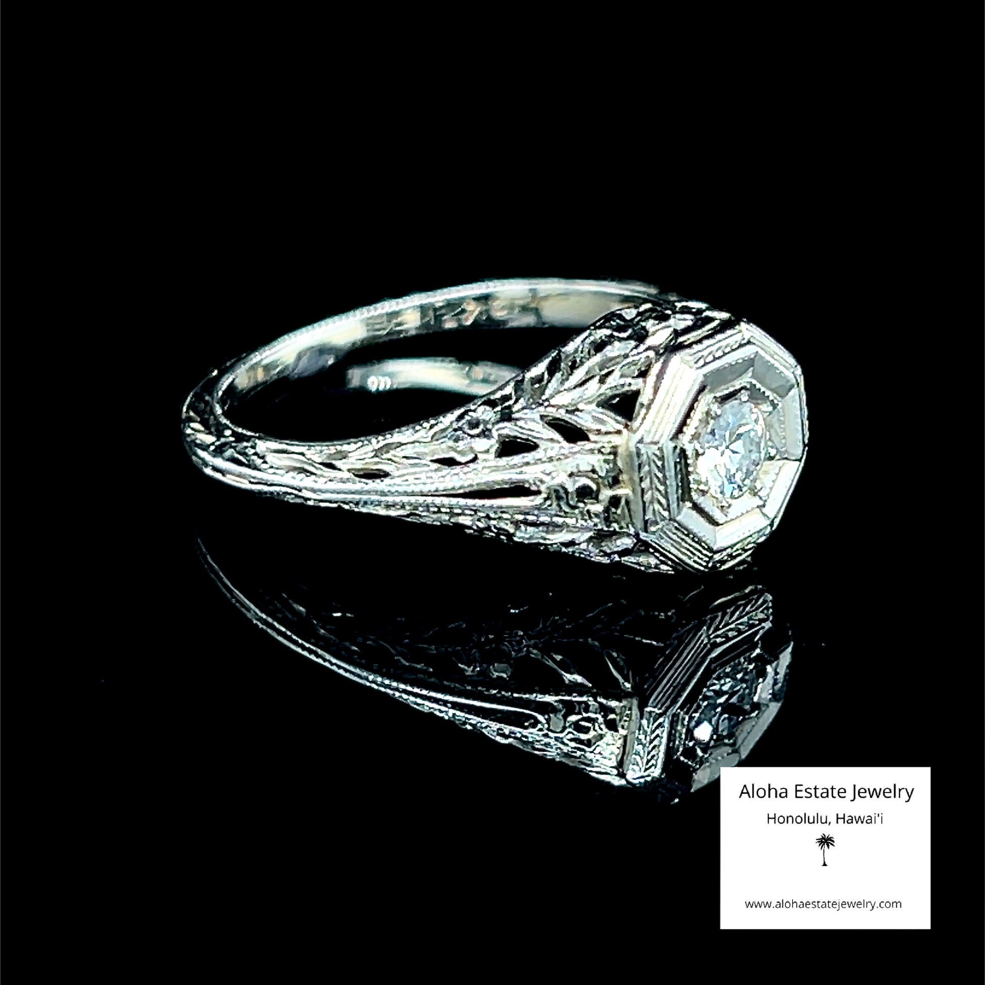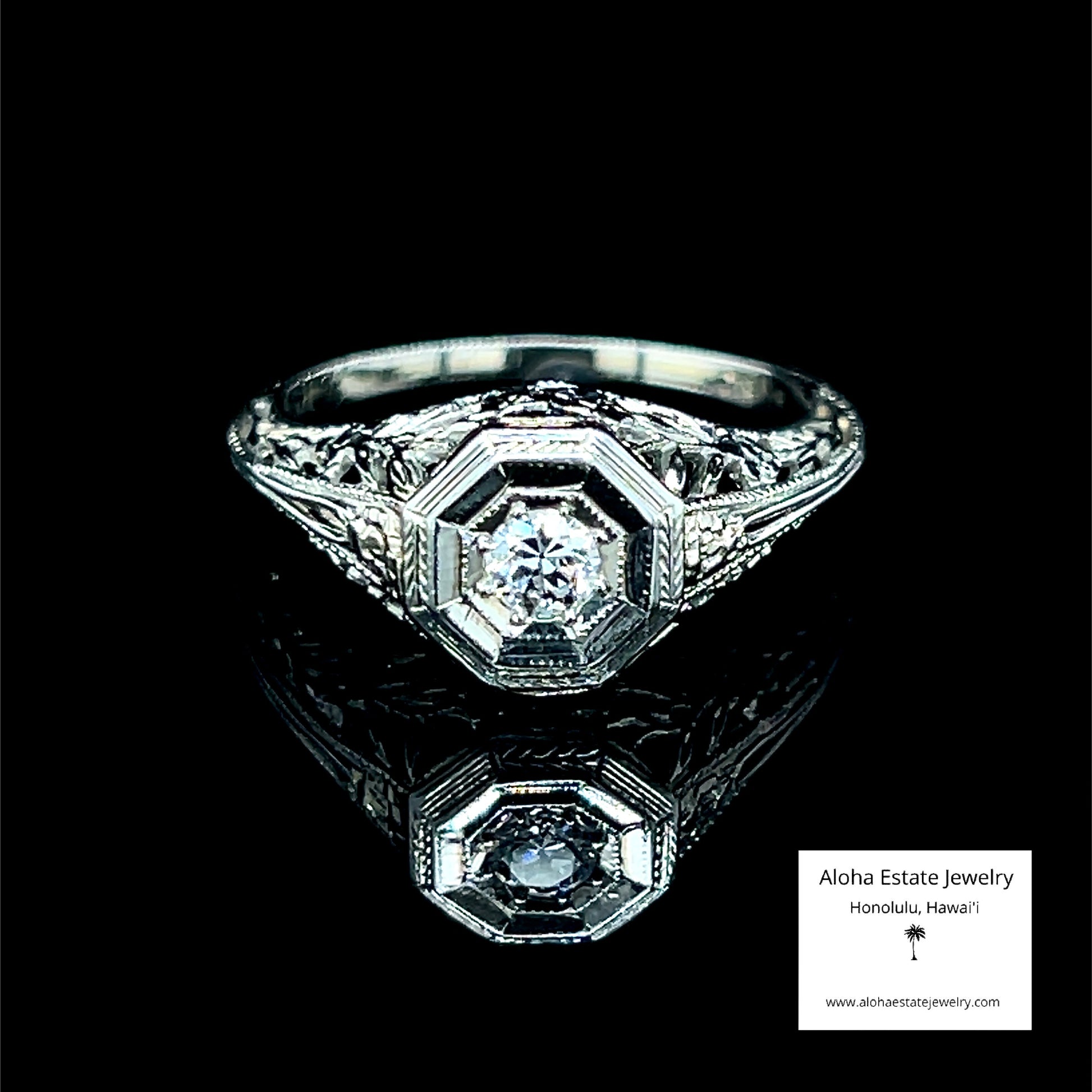 The bold, faceted octagonal shape surrounding the center diamond is one of the hallmark motifs of 1920s–early 1930s Art Deco jewelry. The intricate, lacy white-gold openwork on the shoulders with scrolling and floral motifs is typical of high-quality American and European engagement rings from the late 1920s to very early 1930s
