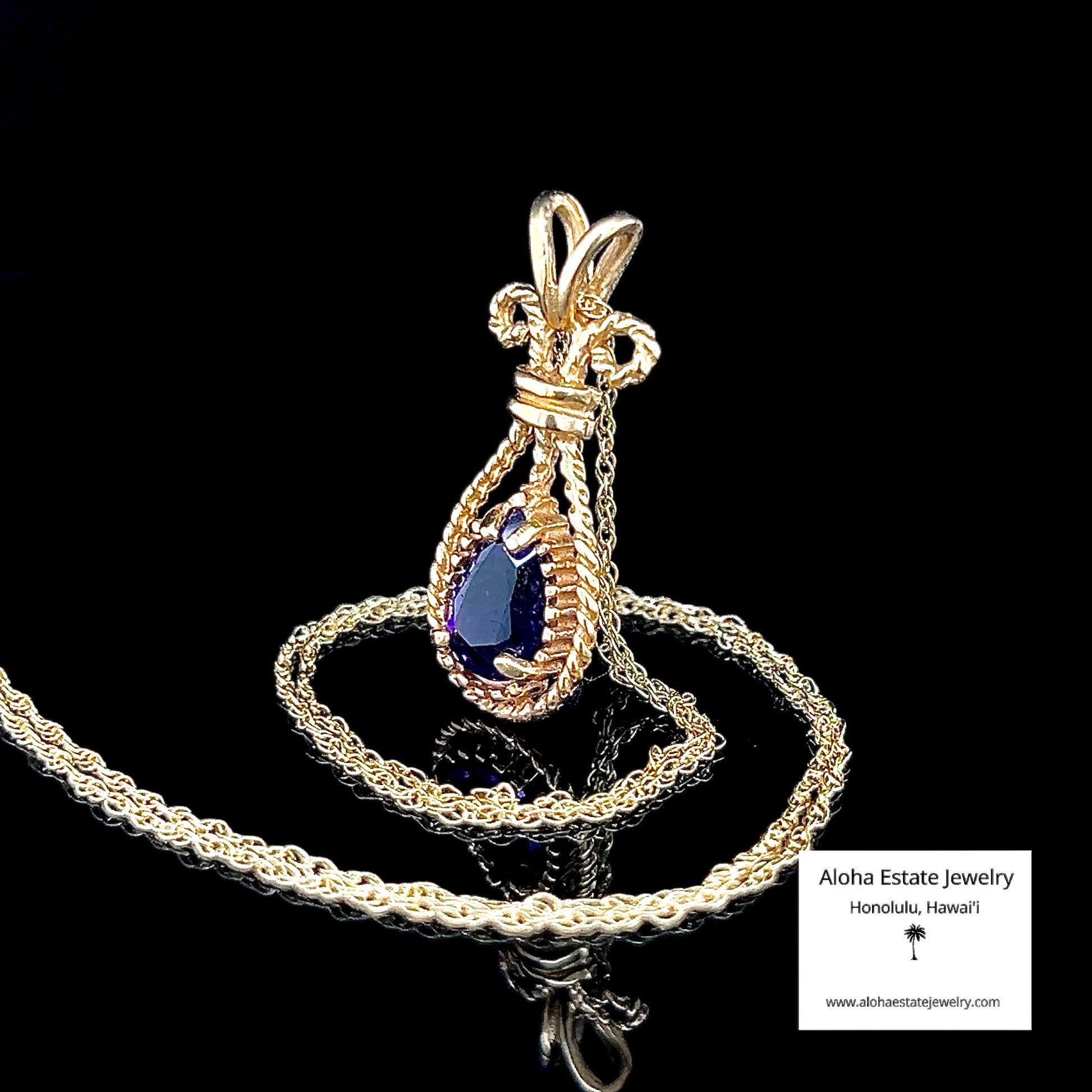 Part of an estate collection since the 1950s, the piece reflects the design quality of decades past. The refined 25mm x 10mm pendant is paired with an 18-inch 14K yellow gold chain, creating a balanced composition that allows the gemstone to command attention while the intricate metalwork provides elegant support.