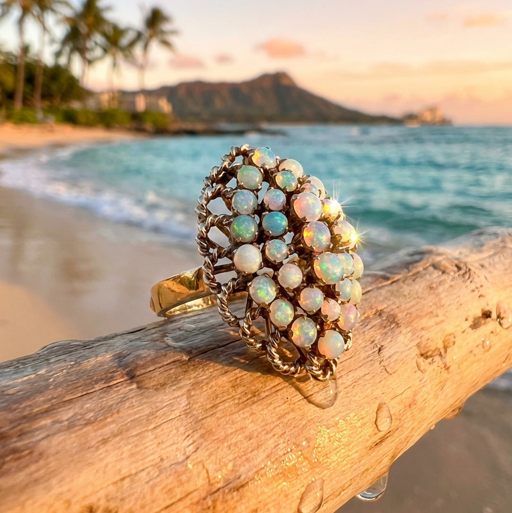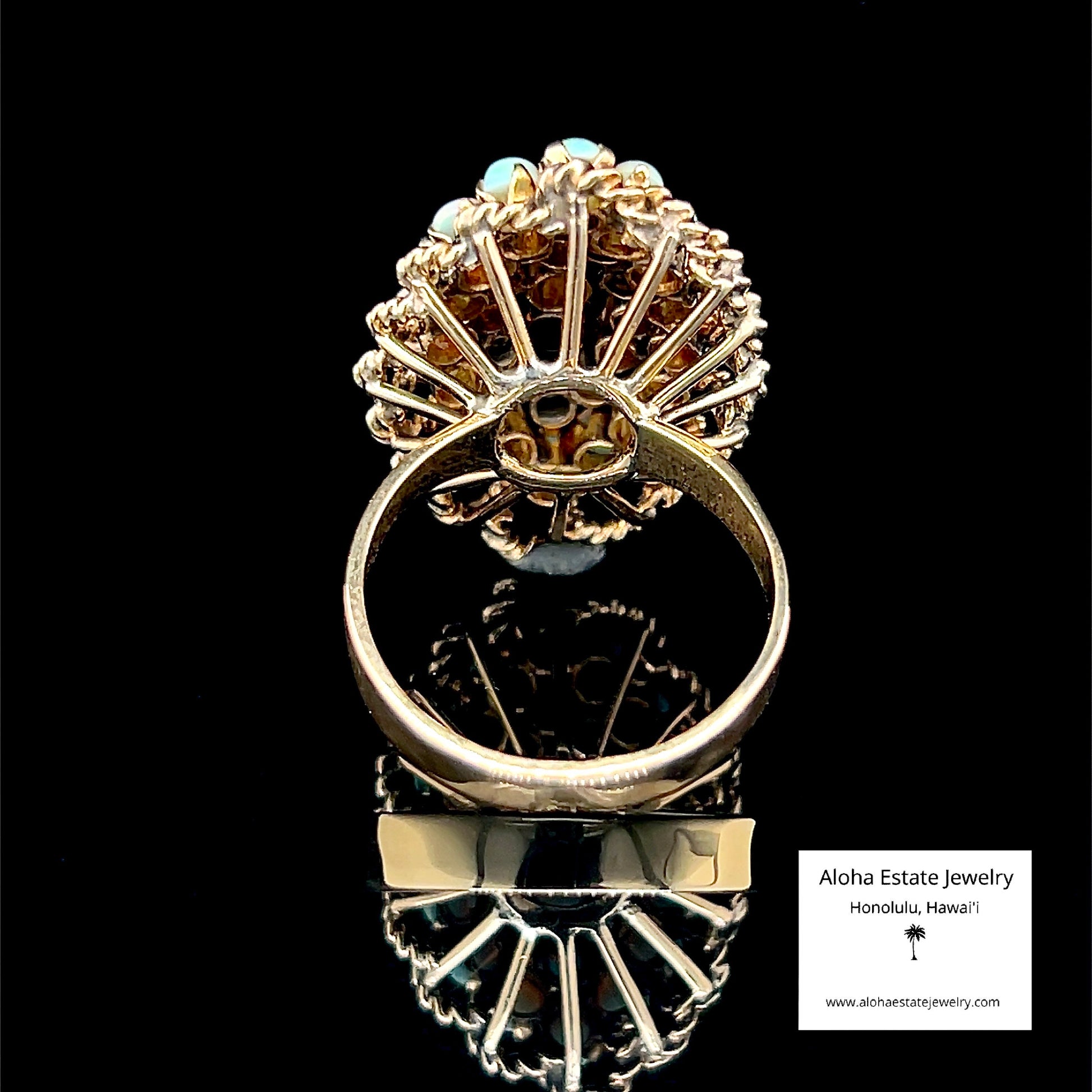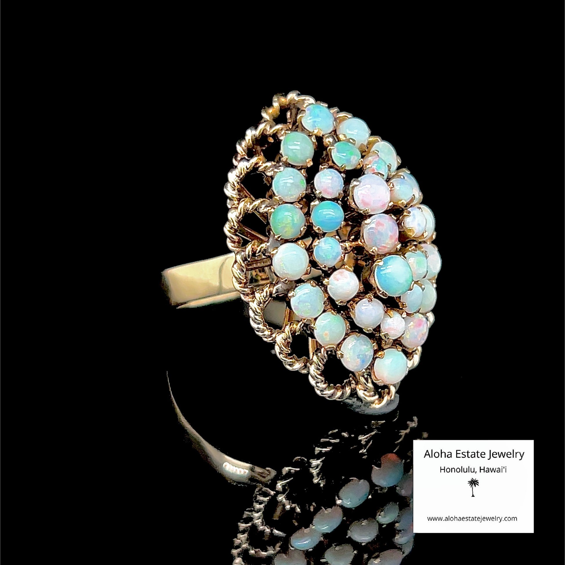 A breathtaking mid-century masterpiece circa 1940–1945: an impressively large and dramatic 31-stone Australian white opal cluster ring hand-crafted in solid 14k yellow gold.