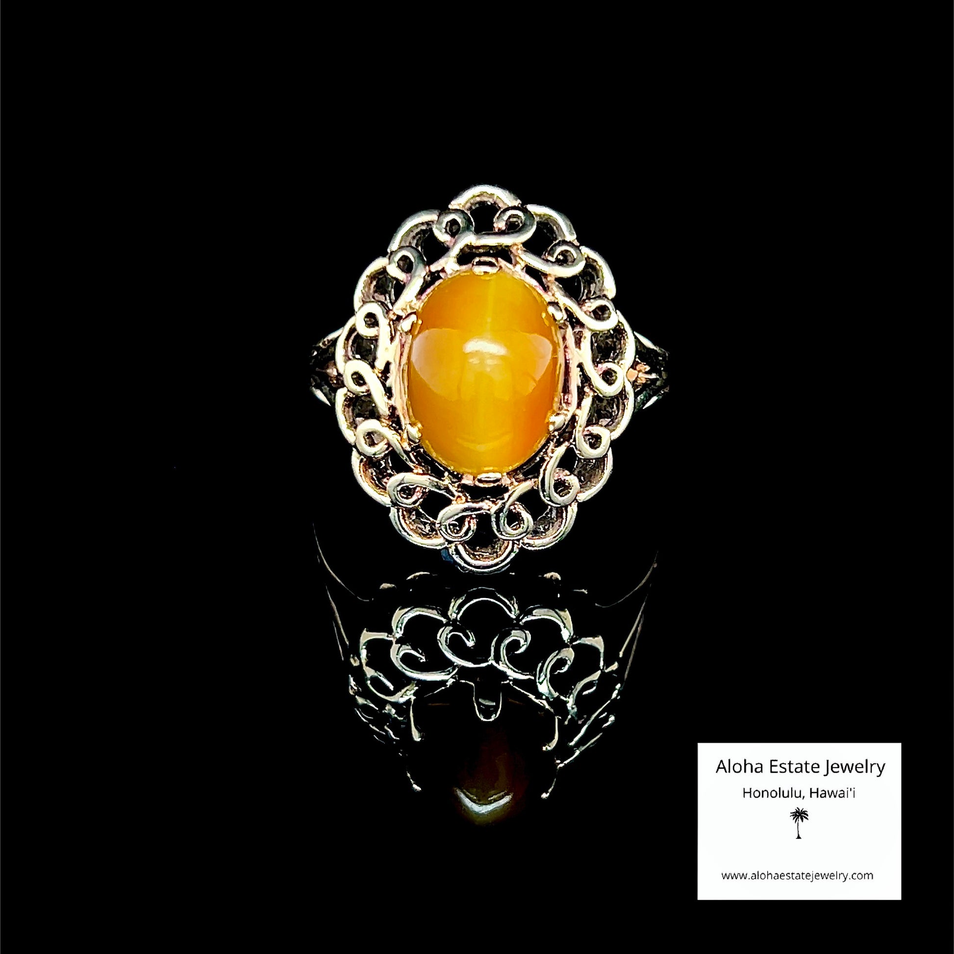 Discover this exquisite antique lady's ring, sourced from a local Oʻahu estate and dating to approximately the 1940s. The 10K yellow gold setting features an intricate chain-filigree design that frames a stunning natural cat's eye gemstone in a warm honey-gold tone.