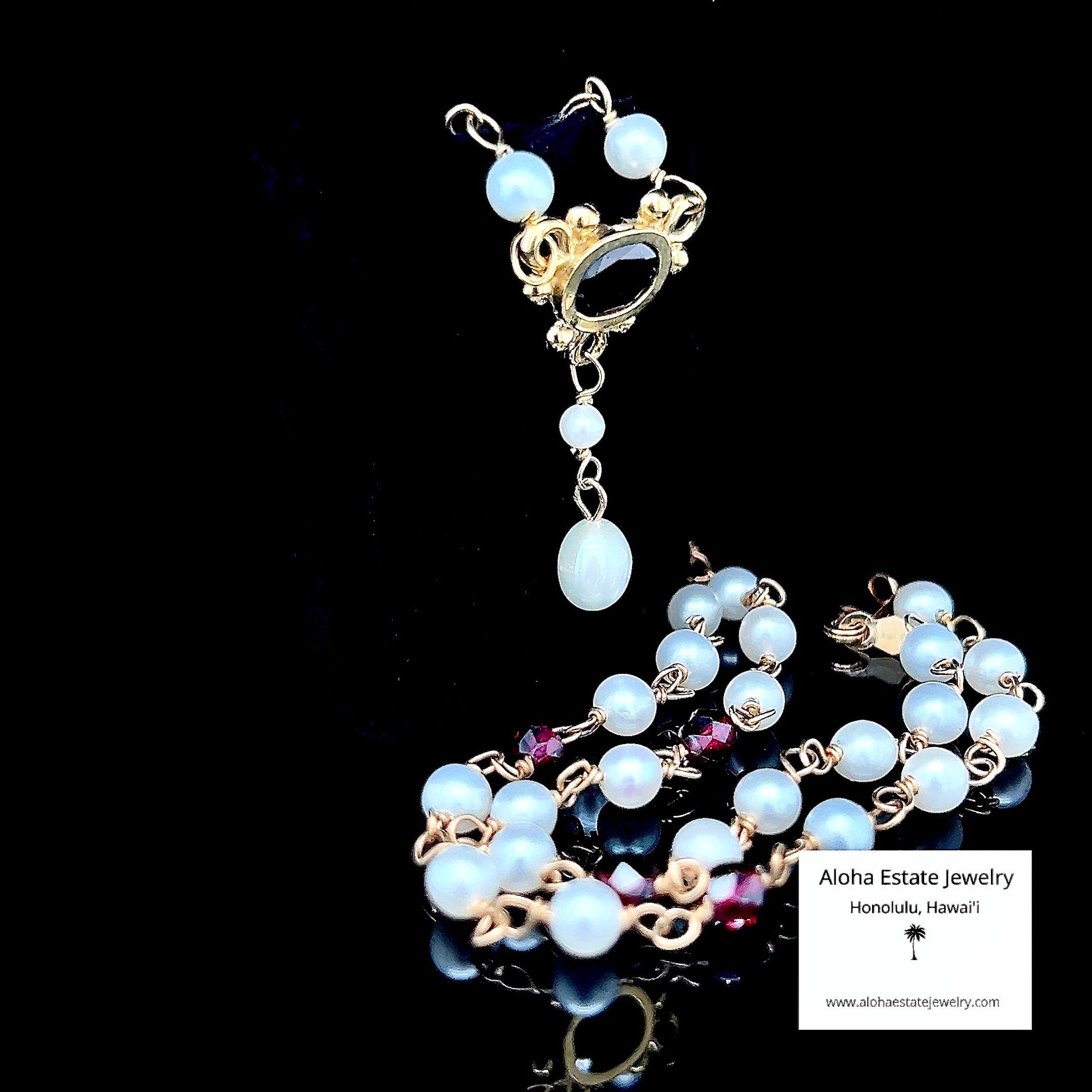 The luminous 4 mm cultured pearls glow with soft orient, interspersed with vibrant rhodolite garnets of purplish-red hue. At the center hangs a victorian inspired pendant set with a richly saturated pyrope garnet displaying classic deep red with subtle rust-brown undertones β a highly desirable color in antique garnets.