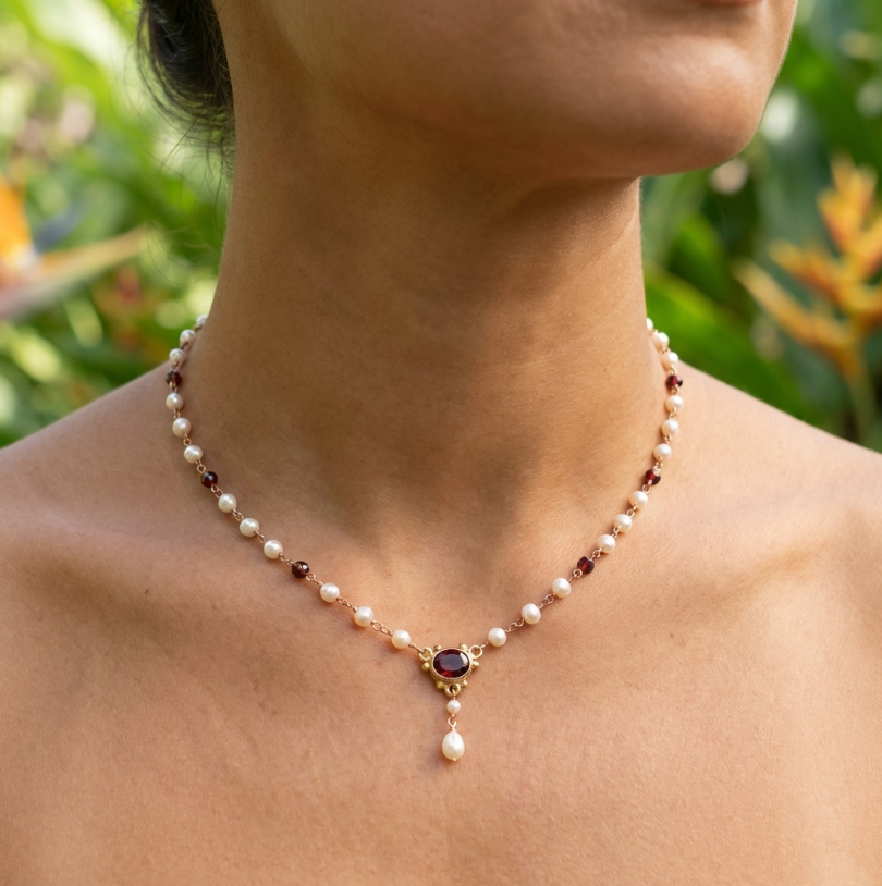 - Garnets: Natural faceted rhodolite (strand) + central pyrope garnet