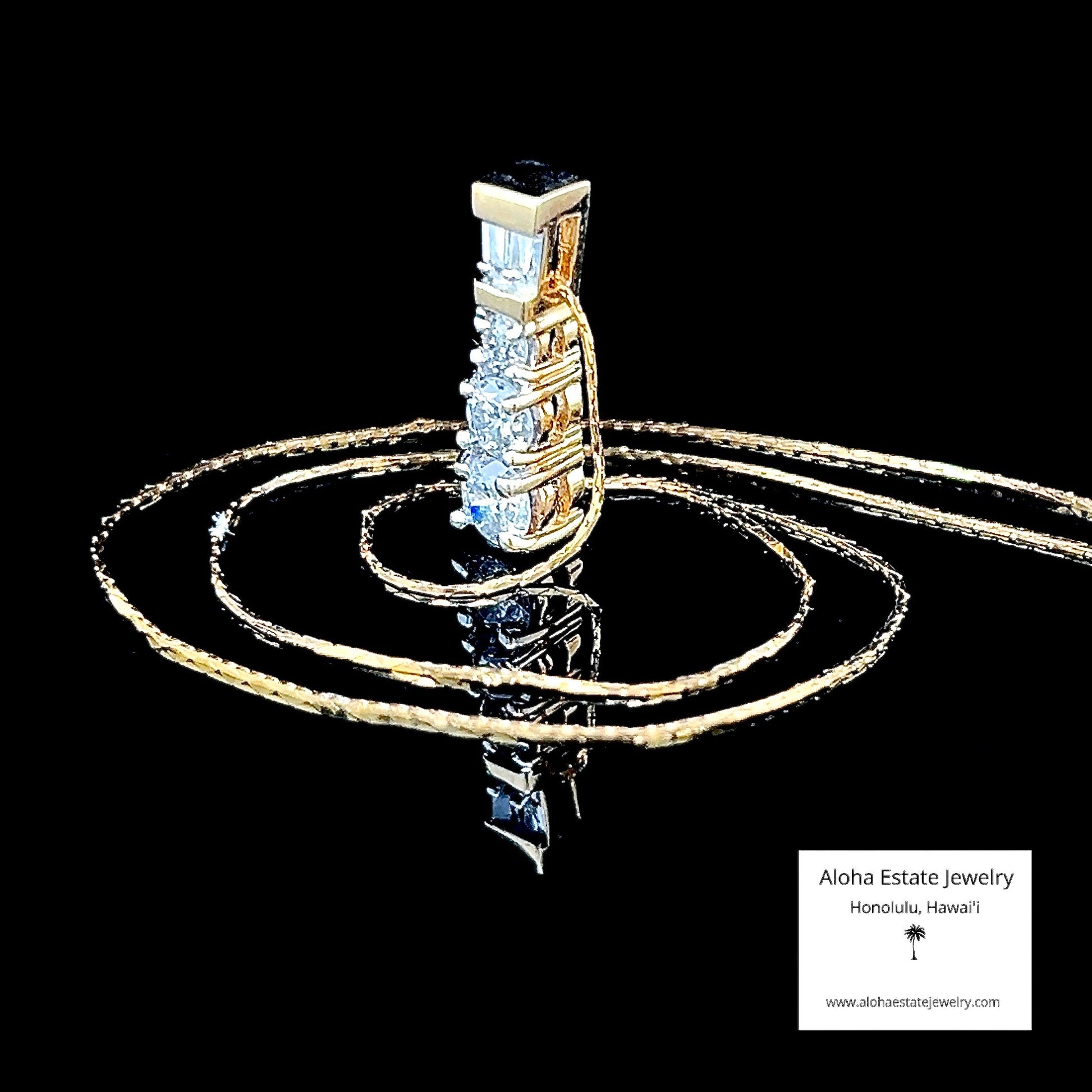 Expertly set in 14K yellow gold, this piece features three natural diamondsâmeasuring 2.6mm, 3.7mm, and 4mmâtotaling one-half carat of brilliance. Each stone is eye-clean and near-colorless, ensuring exceptional clarity and sparkle that complements any complexion or wardrobe. Two additional natural baguette diamonds grace the pendant's top, adding subtle dimension without affecting the total carat weight.Â