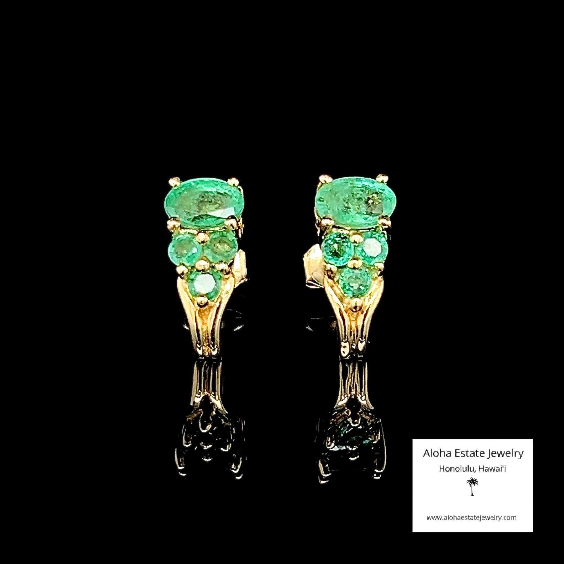 These elegant emerald cluster earrings present a graceful composition of rich green gemstones set in warm 14K yellow gold. Their design reflects a timeless aesthetic rooted in classic mid-century fine jewelry, where symmetry, color saturation, and balanced proportions were paramount.