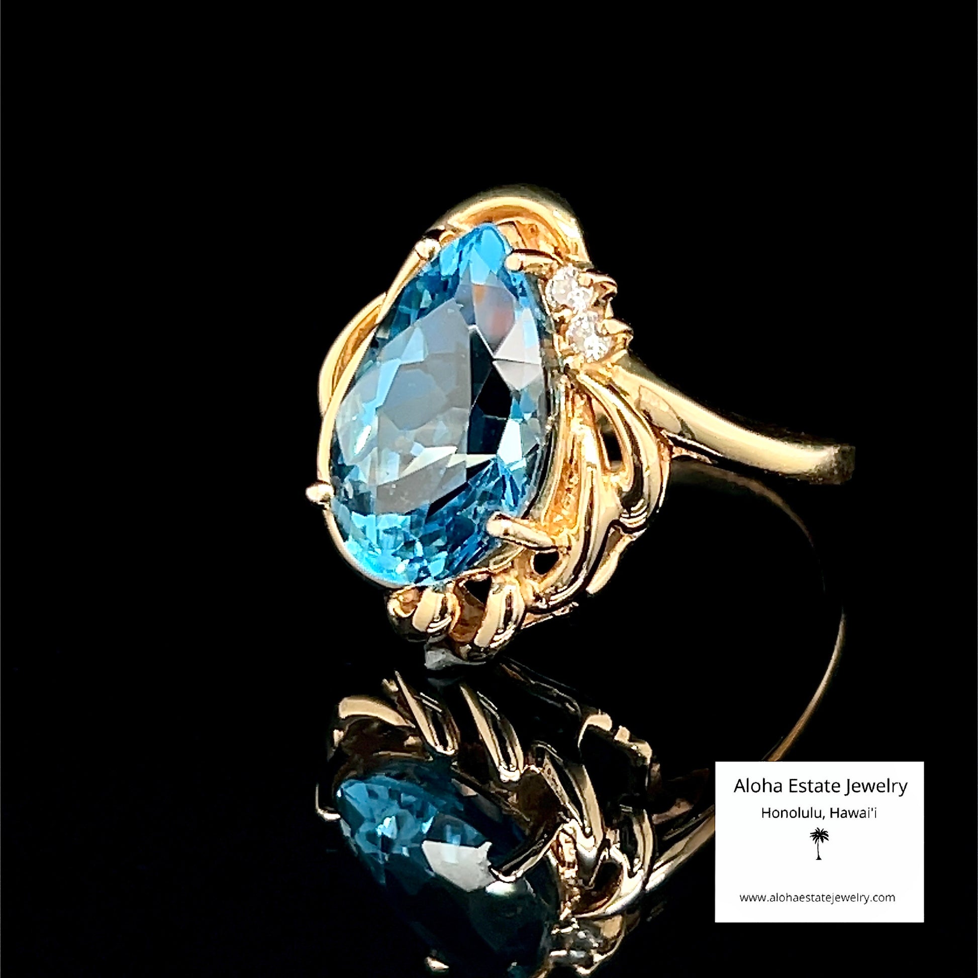 A striking statement piece, this Estate 14K Swiss Blue Topaz Ring showcases a magnificent ~5 1/2 carat pear-cut gemstone in a rich, saturated blue that commands attention.Â