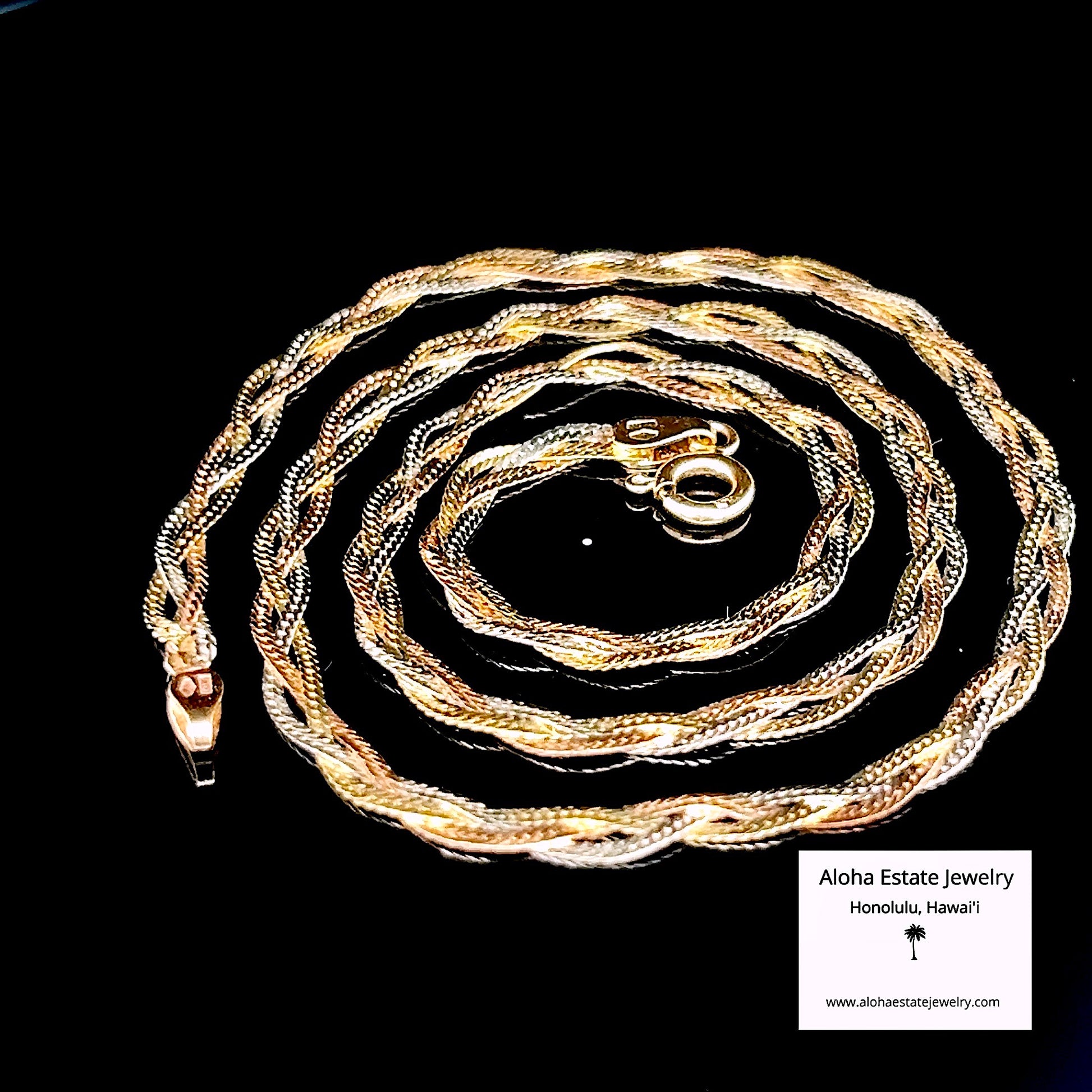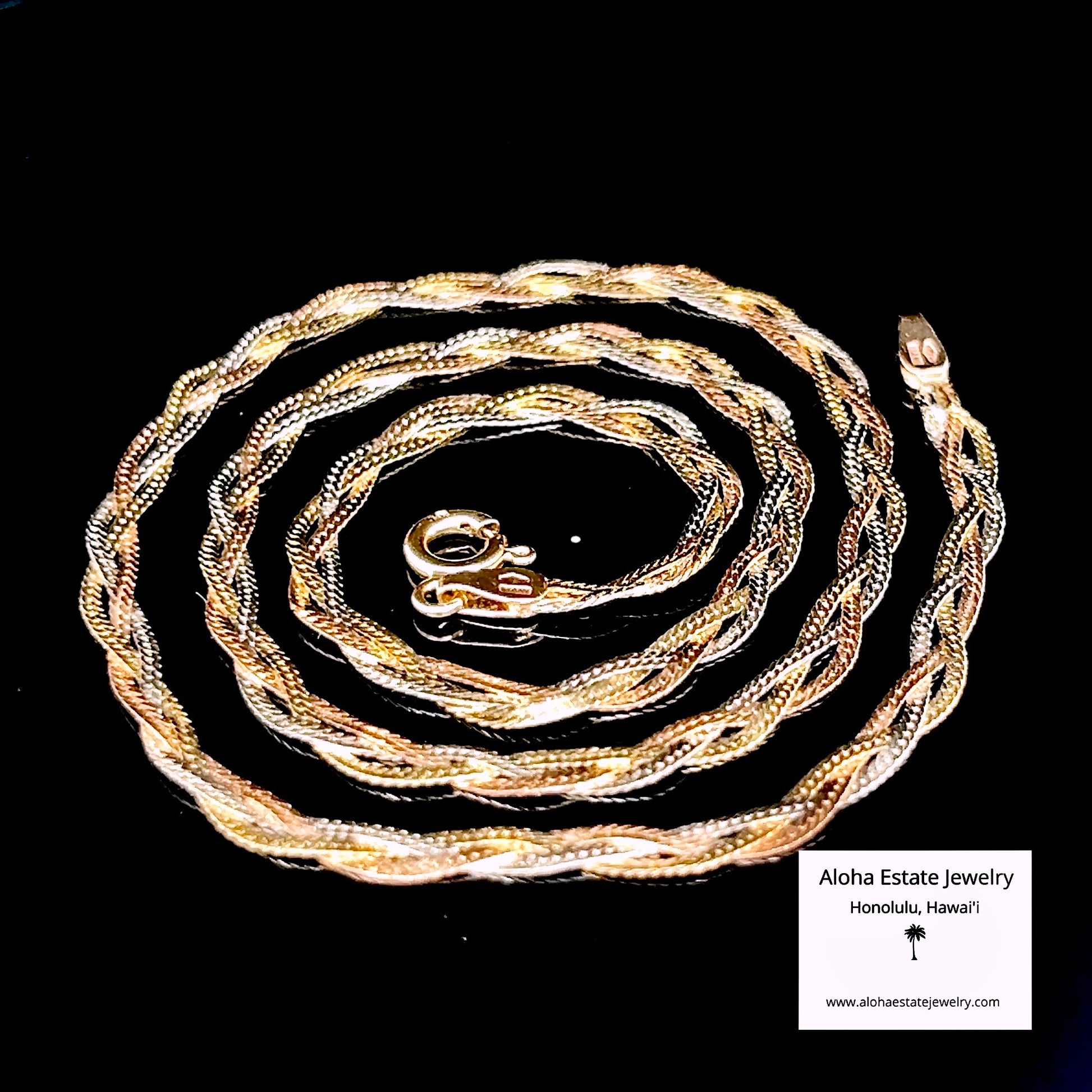 This tri-color braided necklace showcases three interwoven herringbone chains in white, yellow, and rose gold, creating a sophisticated interplay of warm and cool tones.
