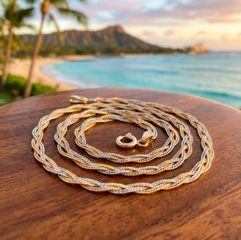 This tri-color braided necklace showcases three interwoven herringbone chains in white, yellow, and rose gold, creating a sophisticated interplay of warm and cool tones.Β