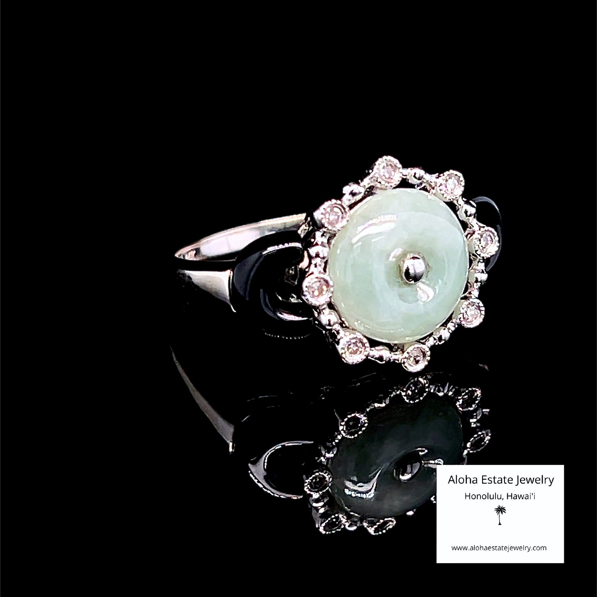 Flanking the disc are curved black nephrite jade shoulders, while eight natural diamonds form an elegant halo around the composition. Expertly cut and set, the ring combines two distinct jade varieties with diamond accents for refined visual depth.