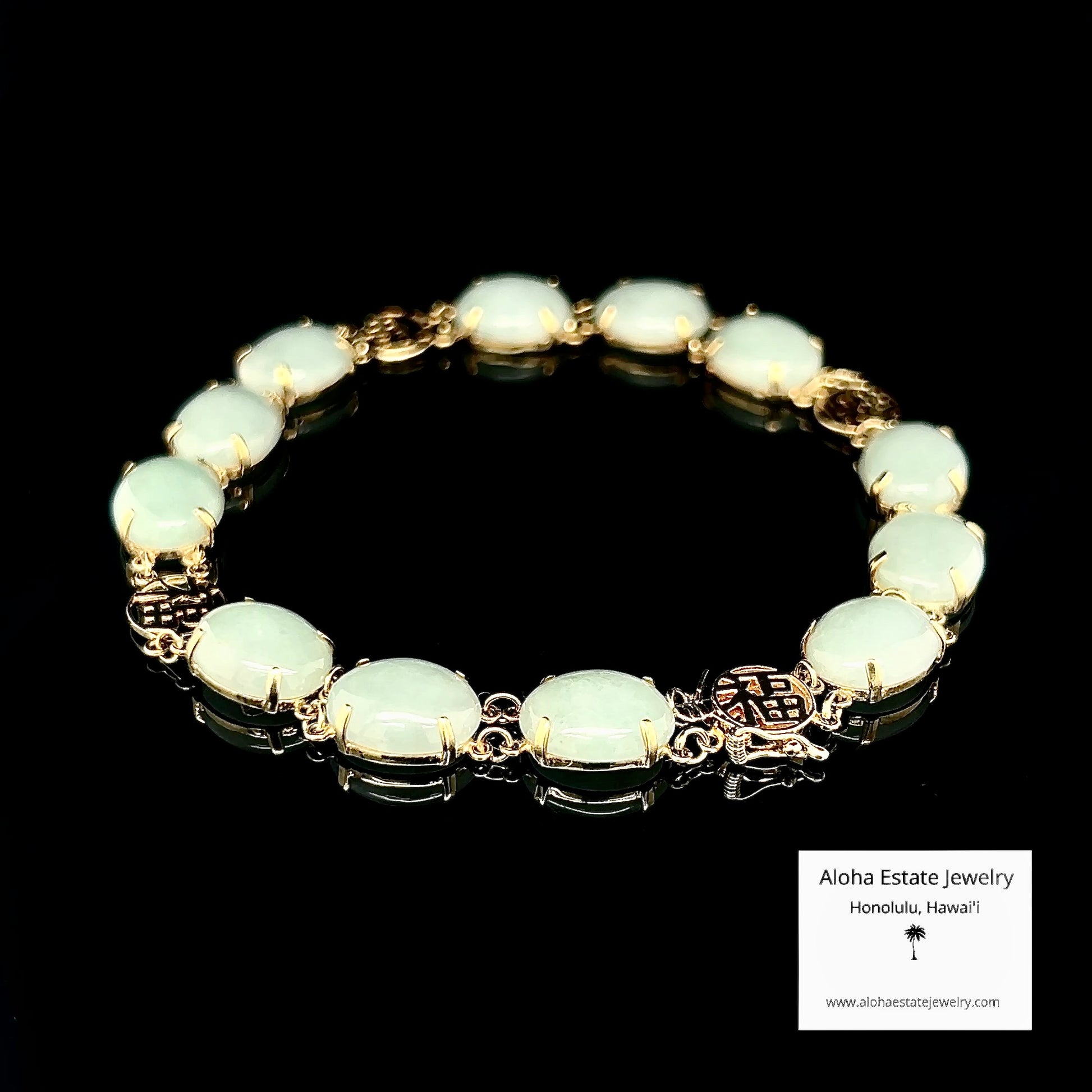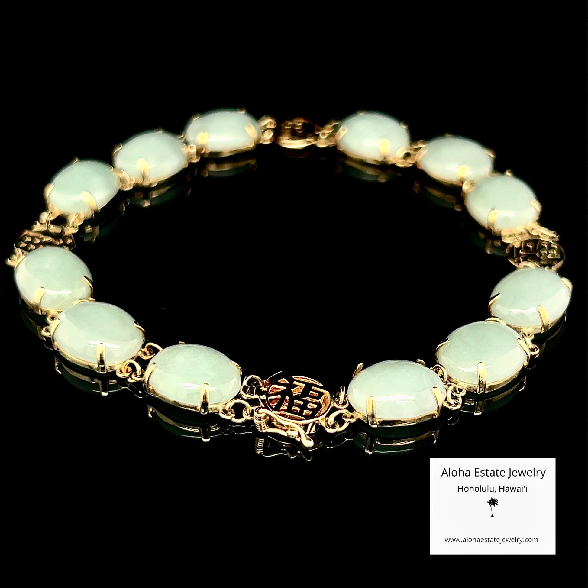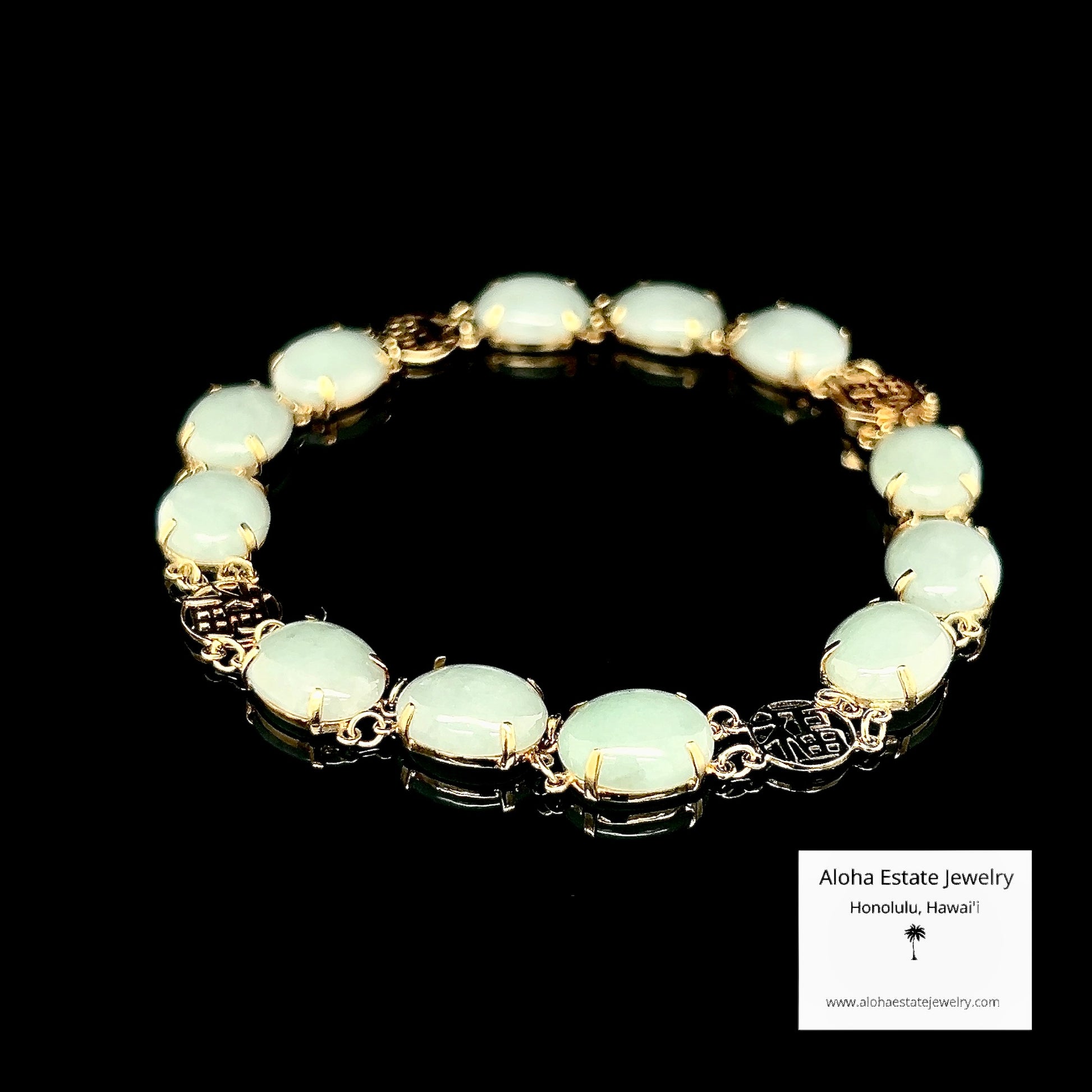 This exquisite estate bracelet is highlighted by twelve light green Type-A jadeite cabochons, each measuring approximately 10mm x 8mm, set in 14k yellow gold.