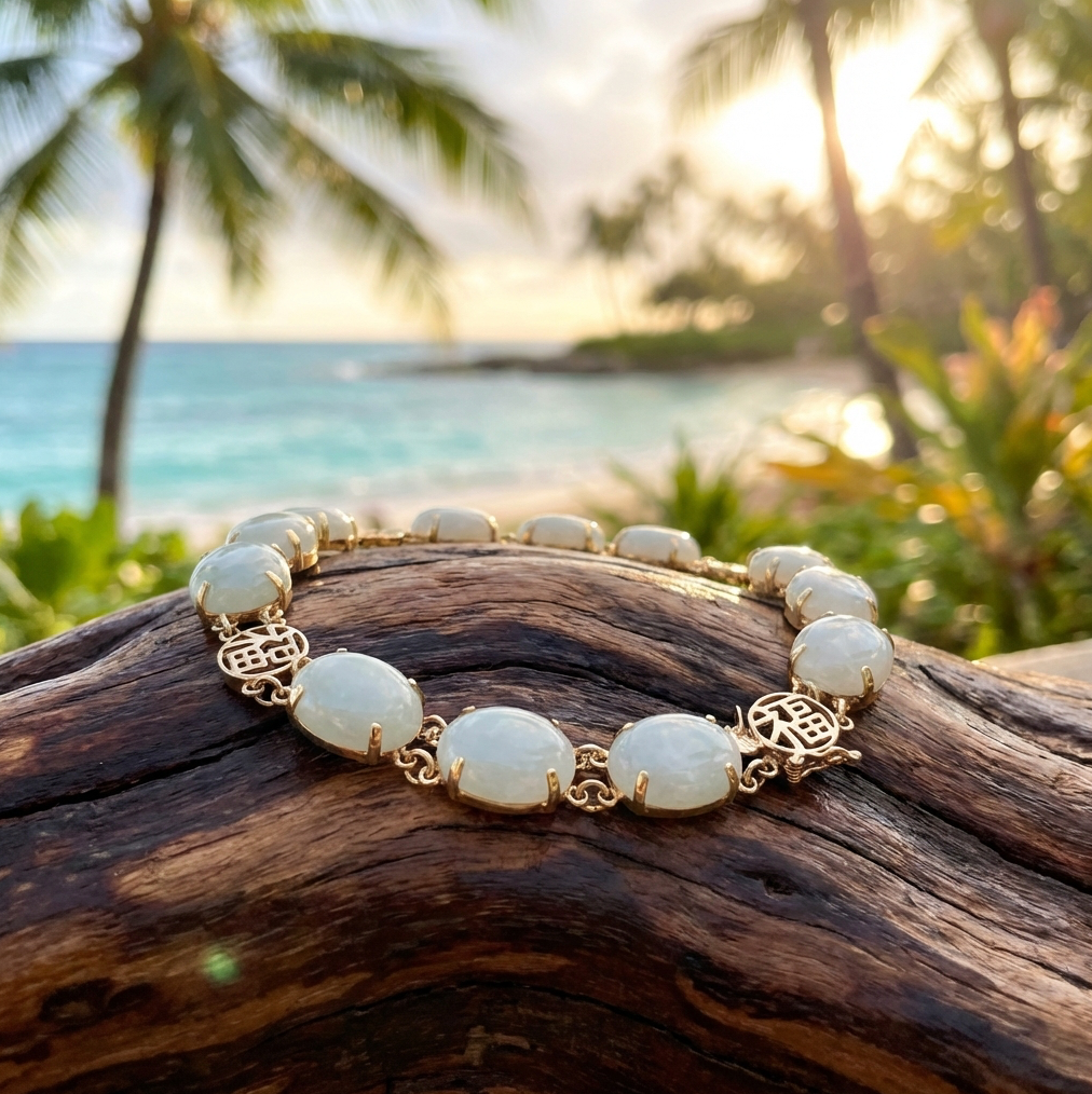 Sourced from an O'ahu estate, the piece features substantial, translucent stones that glow warmly when illuminated. Traditional Chinese "Fu" symbols for longevity, good health, and good fortune are interspaced between every three cabochons, adding cultural significance and refined detail.