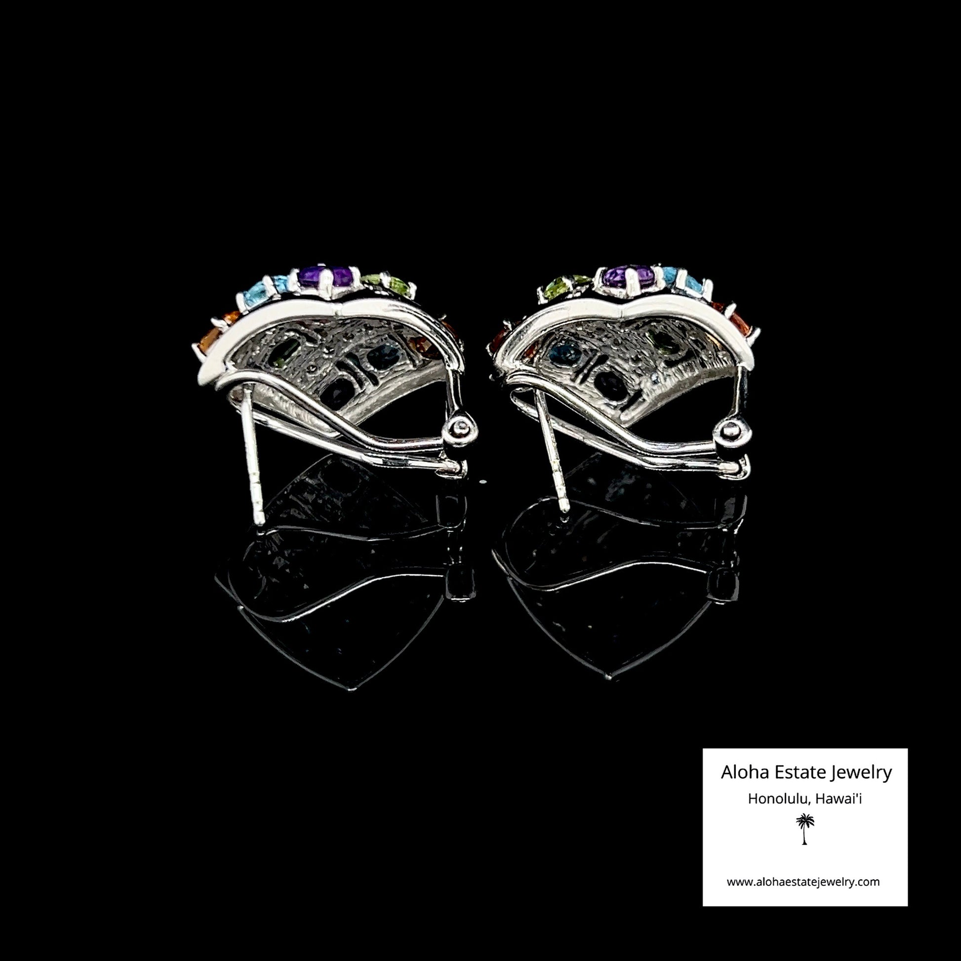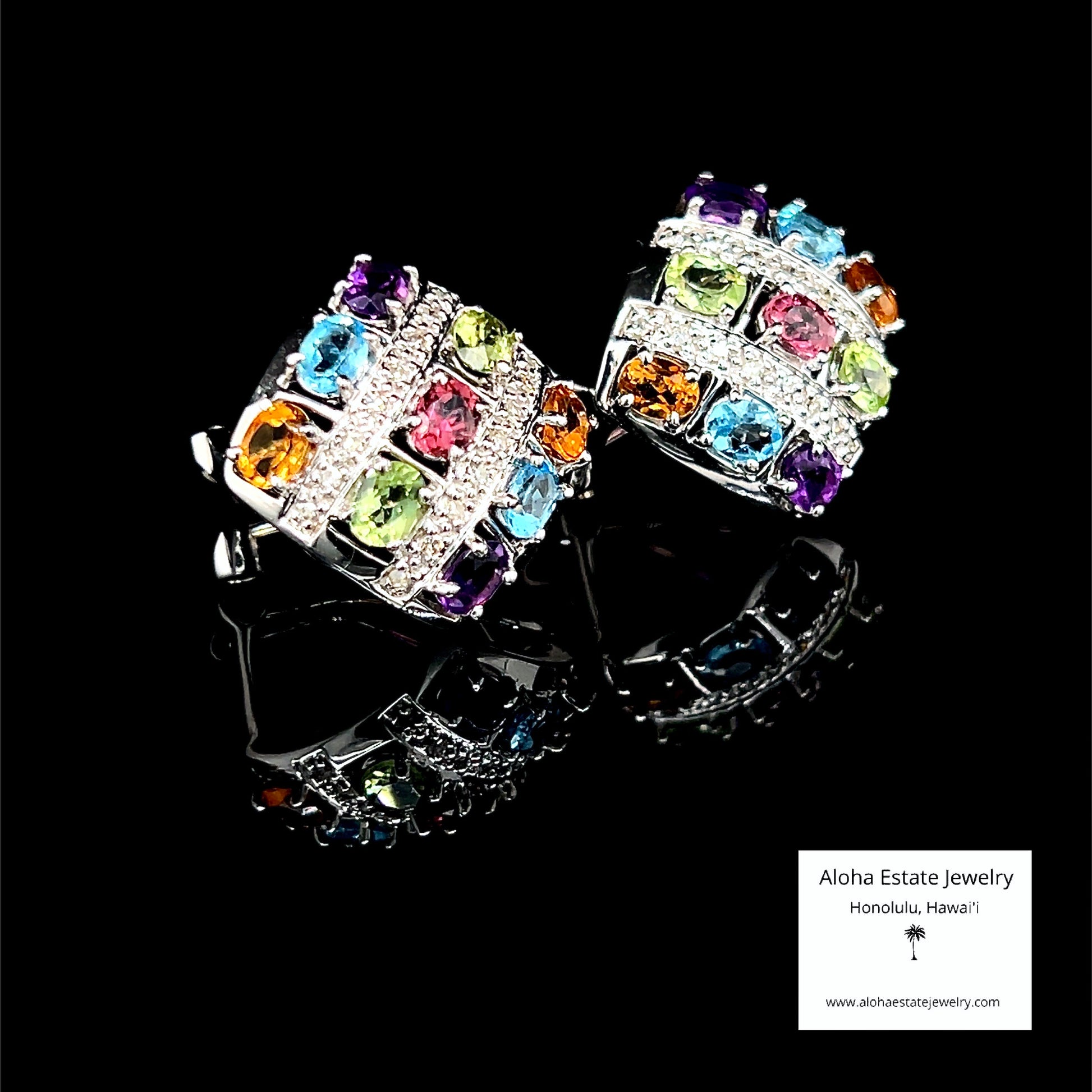 Estate 14K White Gold Multi-Gem Earrings showcase timeless elegance with a carefully curated palette of precious stones. Originally sourced from the Ross Simons Estate Jewelry Collection, these sophisticated pieces feature nine gemstones per earring—green peridot, blue spinel, yellow citrine, and purple amethyst arranged around a central red garnet—all set in lustrous 14K white gold with diamond accents framing each stone.