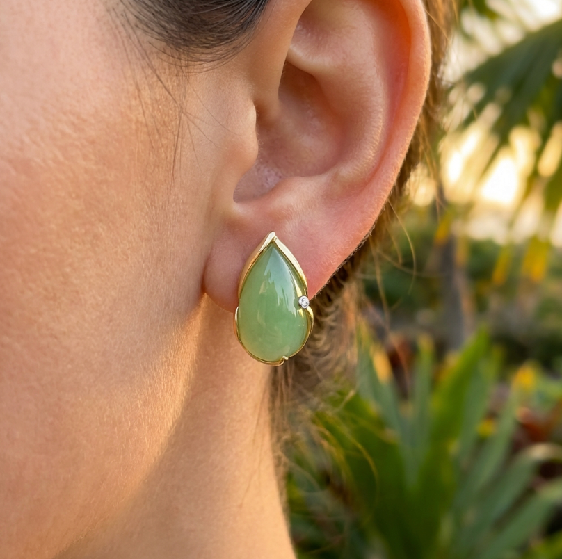 Regal, luminous, and utterly captivating – these vintage earrings showcase two very fine Type-A jadeite cabochons.