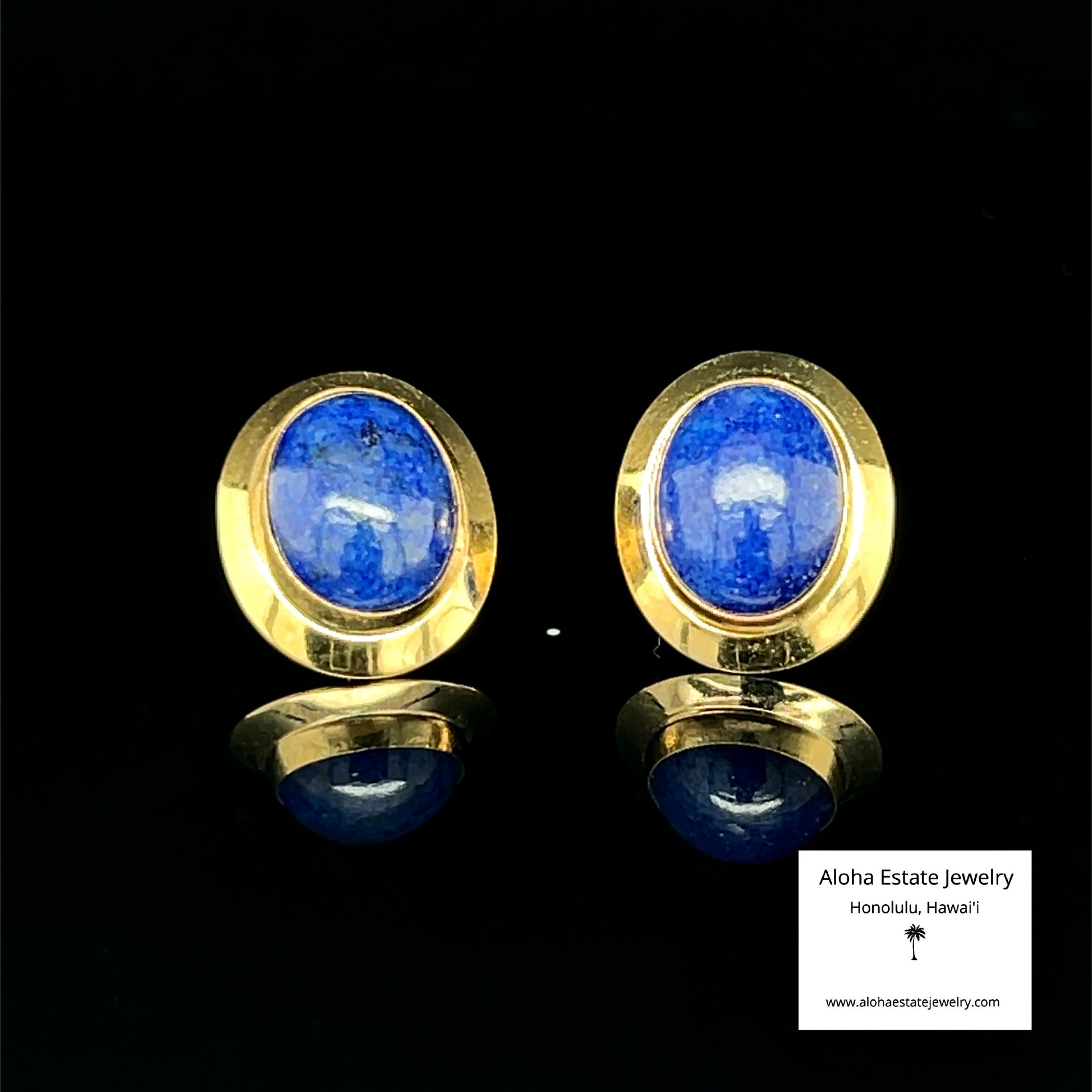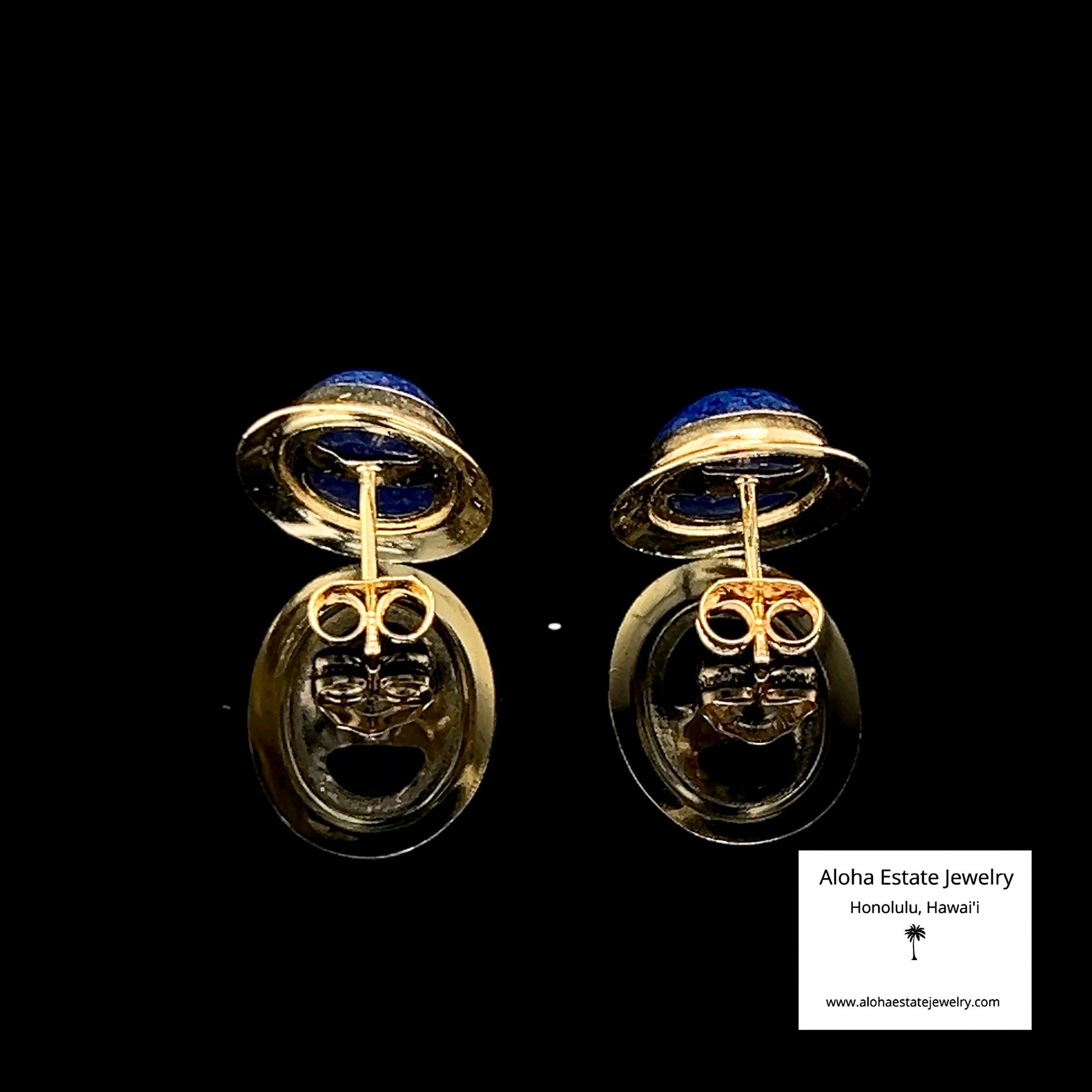 This is an estate pair of earrings - probably 1980s or early 1990s. Very well made and in excellent condition. Nice oval frames were assembled in 14K Yellow Gold to hold these very nice Lapis Cabochons. Butterfly backs are 14K as well.