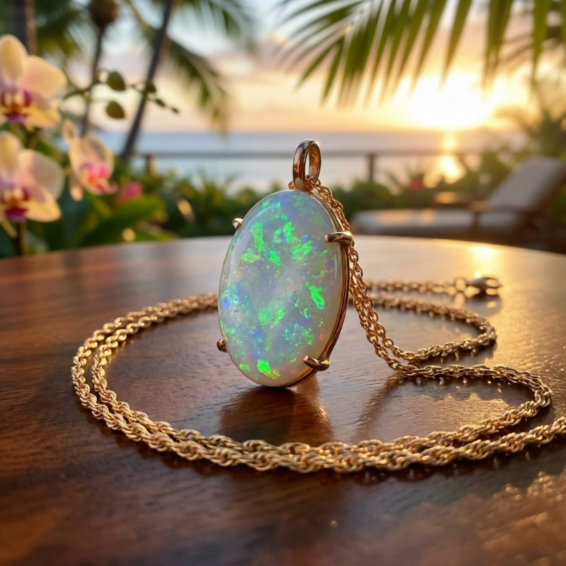 Securely set in a minimalist, elegant 14k yellow gold four-prong frame that lets the opal take center stage. Included is its matching 14k yellow gold 18-inch chain for immediate wear.
