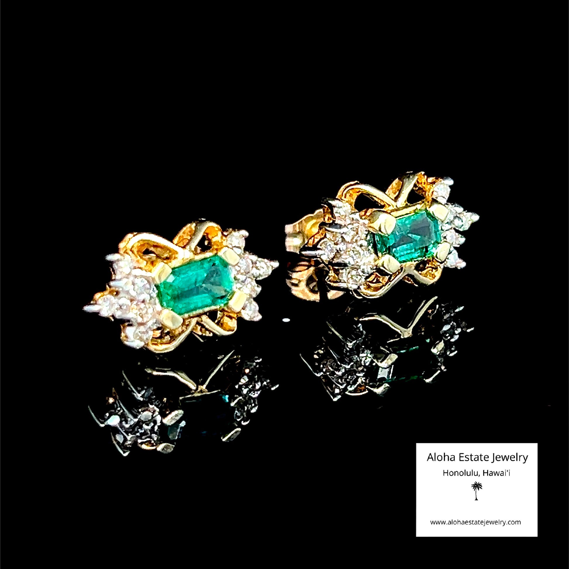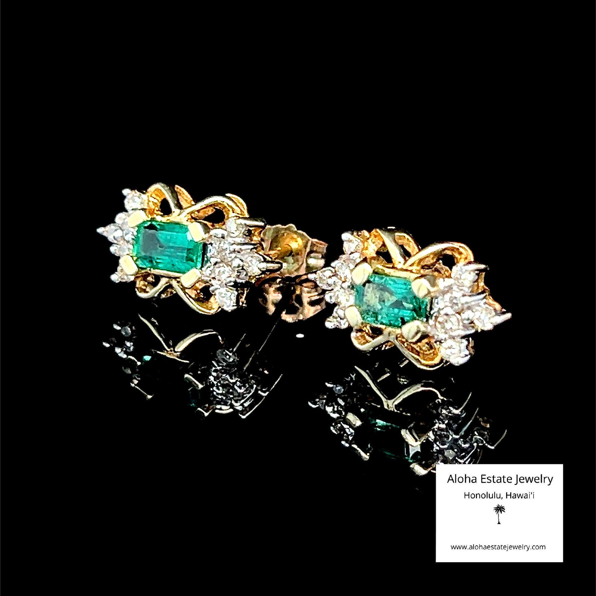 Classic  pair of emerald earrings from the 1970s, these 14K gold earrings showcase the timeless allure of emeralds paired with diamonds.
