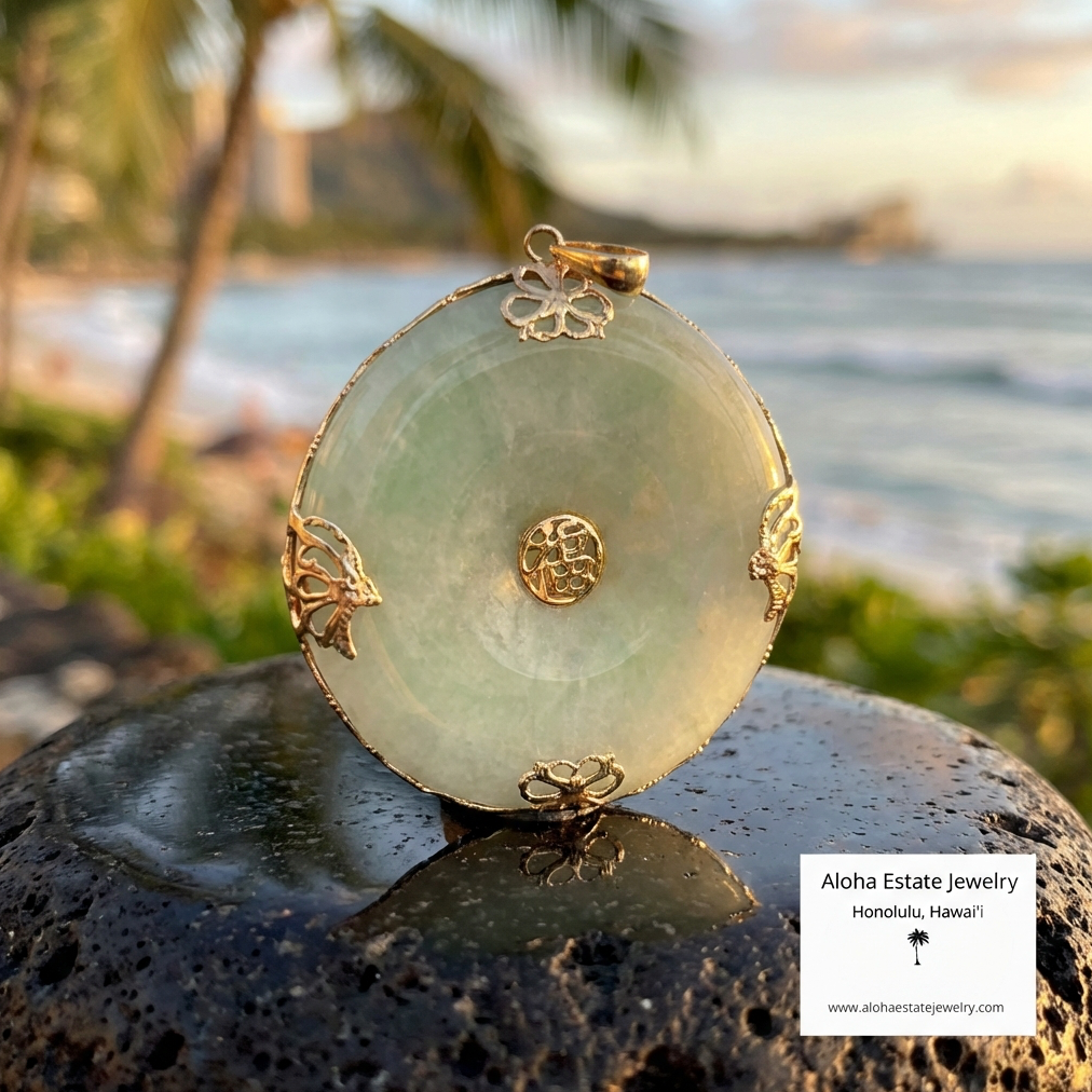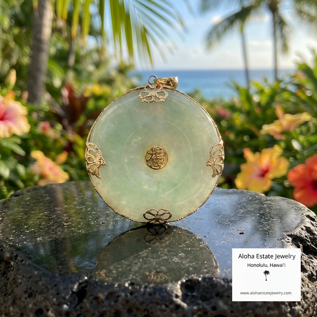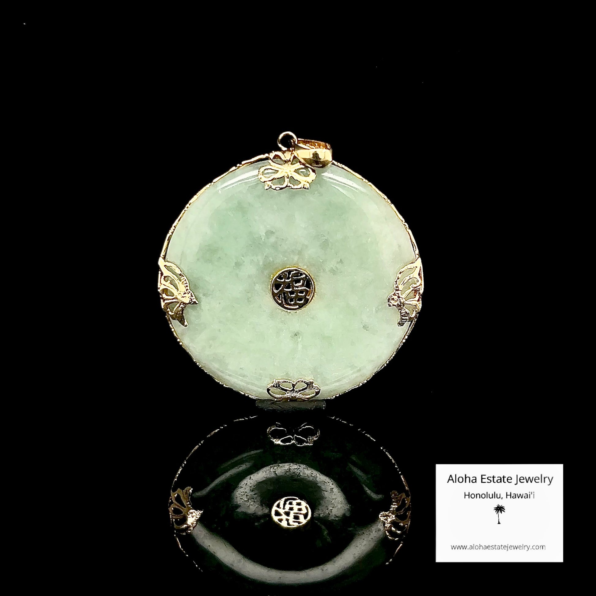 The pierced Fu symbol at its center conveys wishes for good fortune and blessings. Delicate 14k yellow gold butterfly and floral filigree frames the ~37mm pendant, creating an elegant contrast with the jade's luminous depth.
