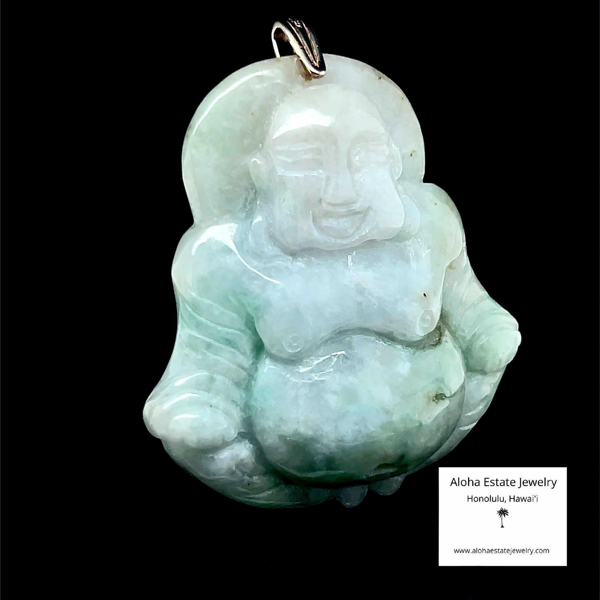 The stone displays subtle white-to-gray tones with soft green undertones, characteristic of authentic, untreated jade. Hand-carved in the classic seated pose of Hotei—the Laughing Buddha—this vintage piece embodies timeless spiritual symbolism.