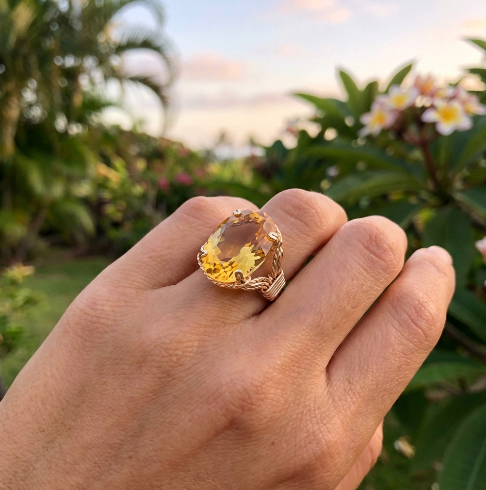This completely handcrafted 14K gold ring showcases a striking 19mm x 14mm oval Brazilian citrine, its checkerboard pavilion dancing with light in mesmerizing patterns.