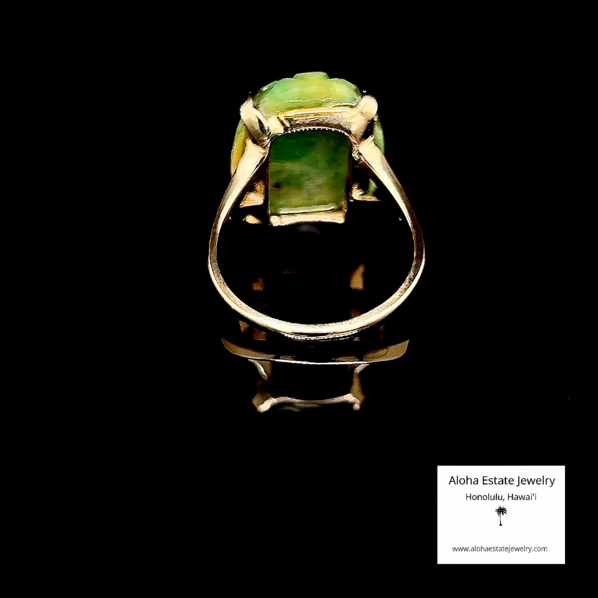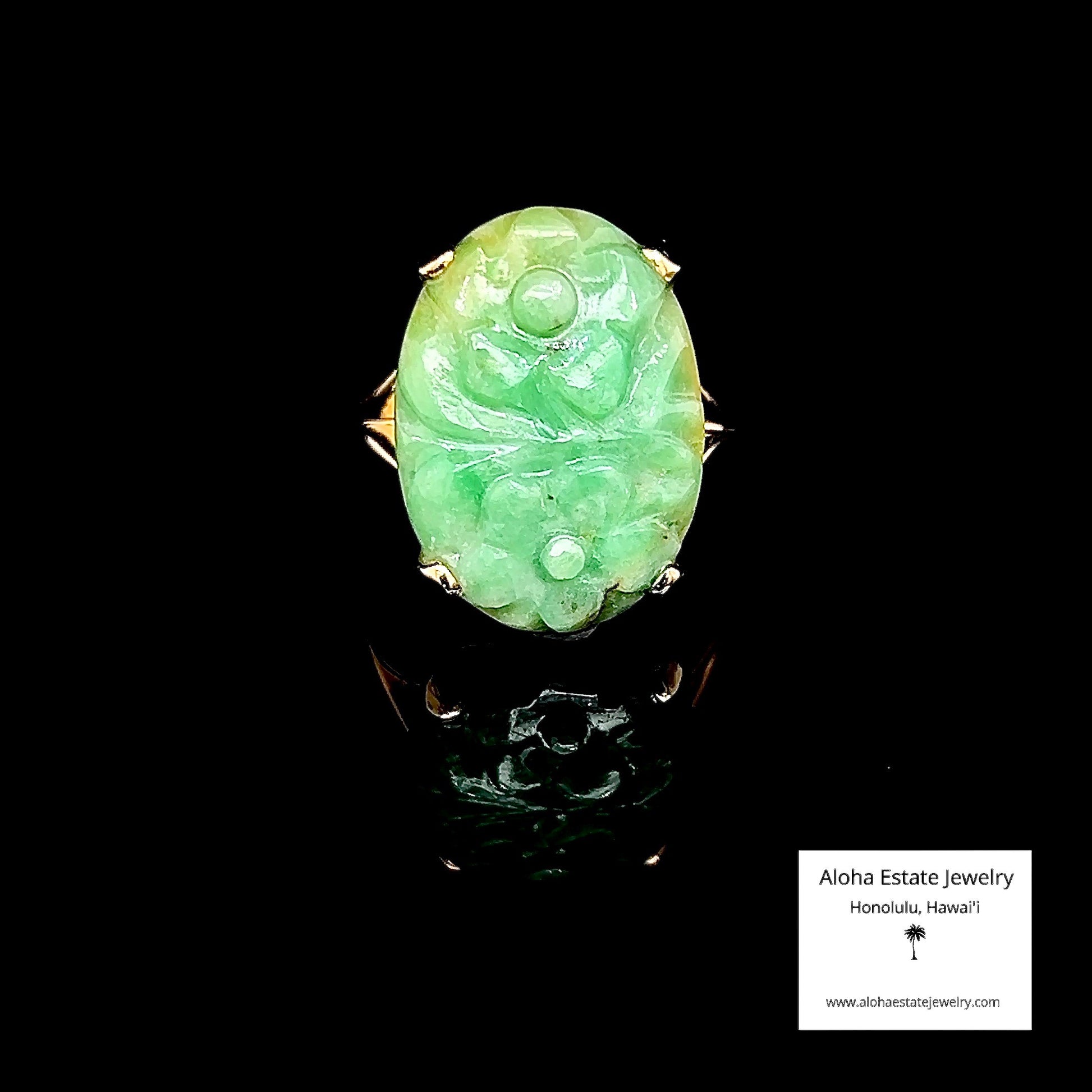 A striking mid-century estate piece sourced from O'ahu, this 1960s ring showcases a hand-carved jadeite cabochon with delicate floral detailing that has retained its crisp definition through the decades.