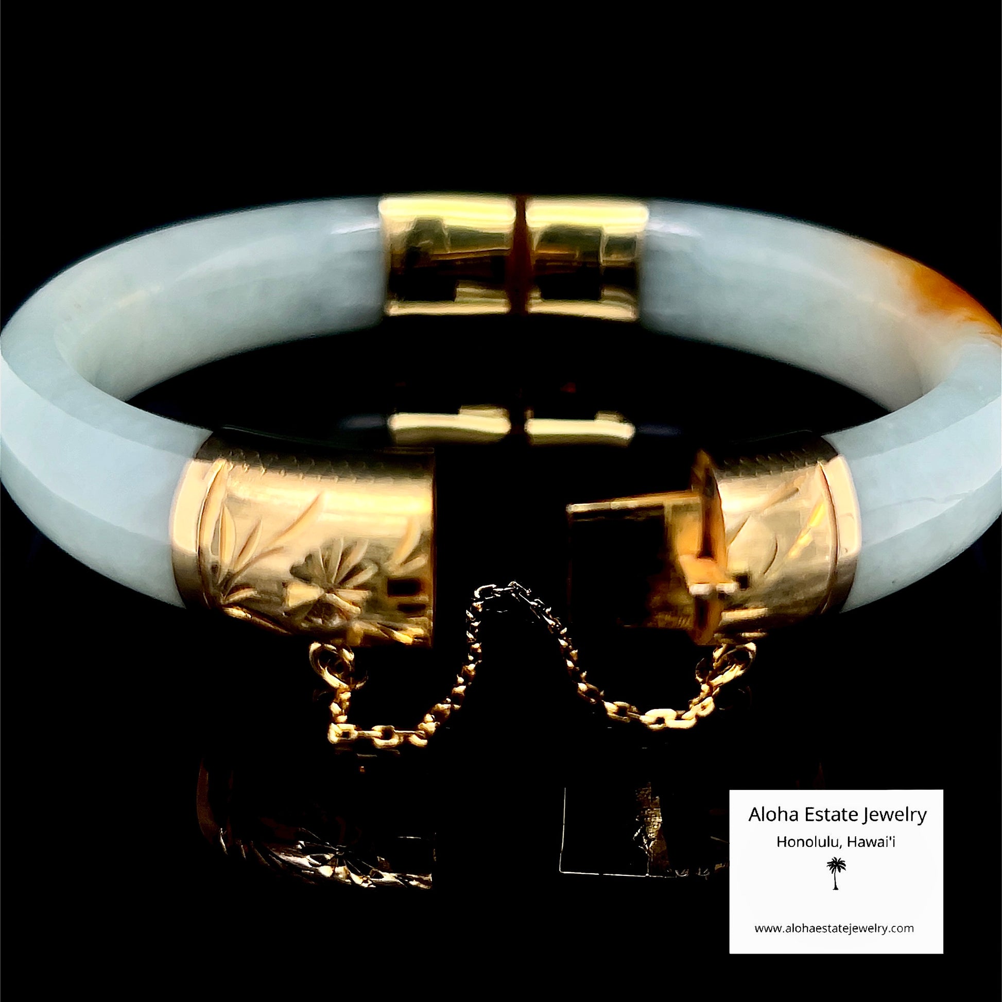 The bangle has an interior diameter of 49mm—corresponding to a delicate size 6.25, ideal for petite wrists—an exterior diameter of 67mm, 12mm width, and a refined weight of 48.1 grams, this hinged bracelet achieves perfect balance between substantial presence and graceful wearability. The 14K yellow gold hardware, including a classic hinged clasp, intricately engraved floral motifs on the caps, and a discreet safety chain, exemplifies the harmonious fusion of Eastern jade artistry and mid-century Western sophistication.
