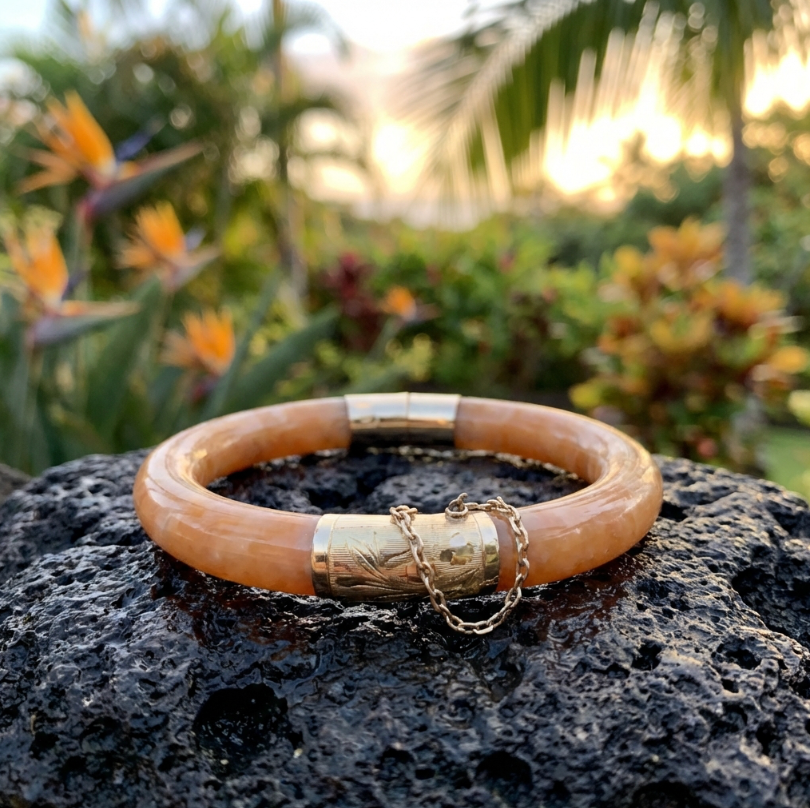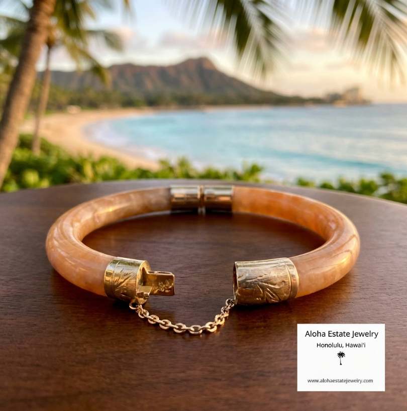 A refined expression of mid-century elegance, this vintage 14k hinged bangle is crafted in richly toned Type-A honey-brown jadeite.