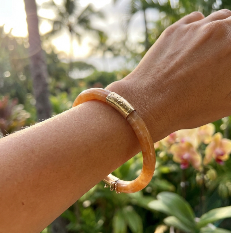 An elegant estate jewel, this honey-brown jadeite bangle pairs beautifully with both modern and vintage collections and embodies the timeless allure of natural jade set in fine gold.