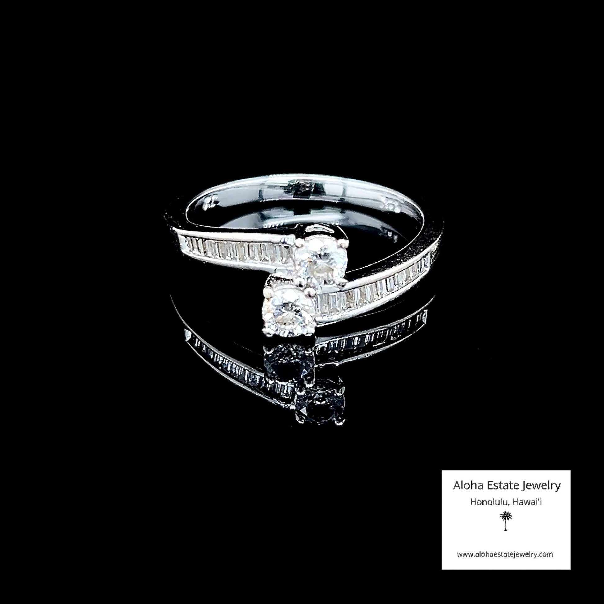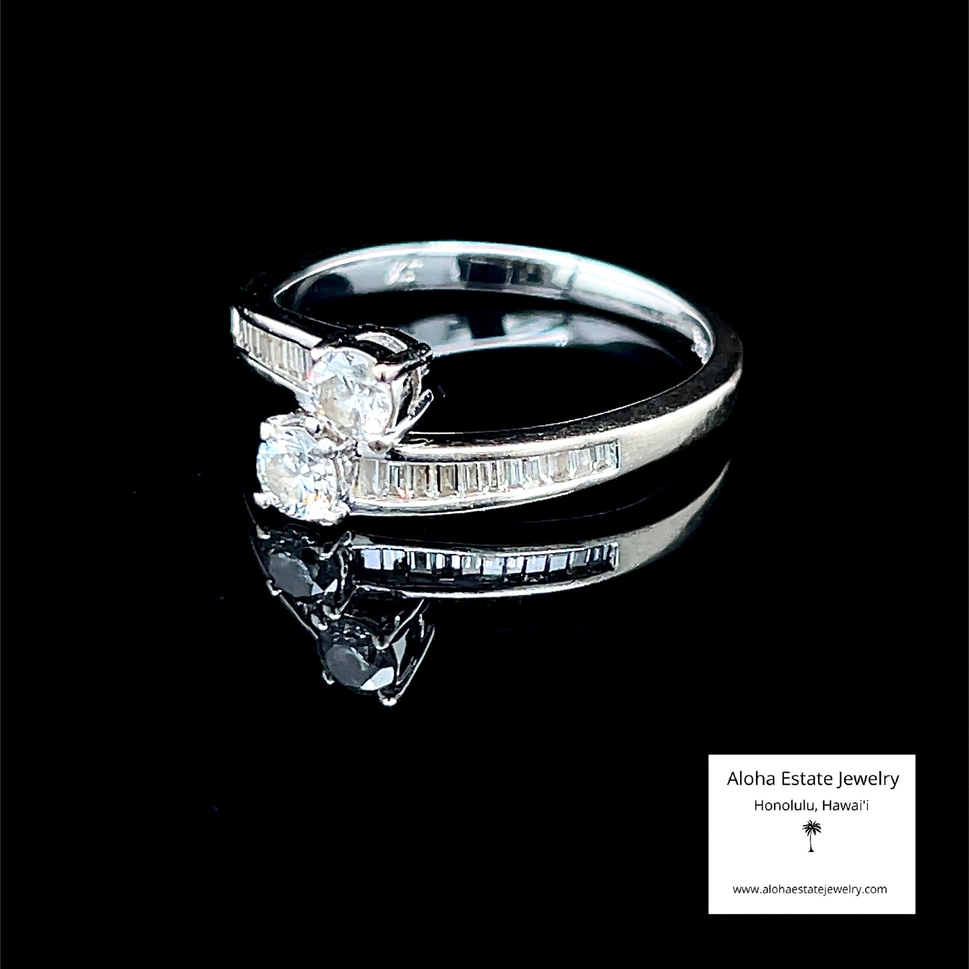 This refined vintage piece features a 14K white gold split-shank design that elegantly frames two eye-clean, near-colorless diamonds of approximately 1/4-carat each.Â