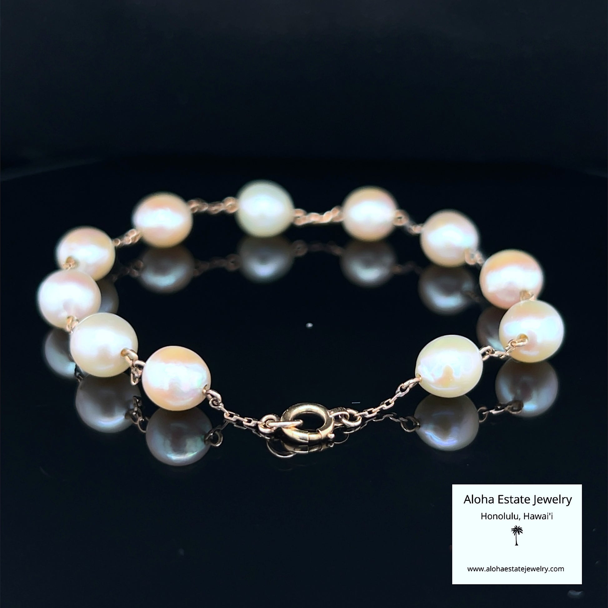 Discover the understated elegance of this vintage station bracelet, where eleven matched Akoya pearls rest gracefully between 18k yellow gold links. Each lustrous pearl, averaging 7mm in diameter, showcases the subtle complexity of natural gems—predominantly white with delicate pink, red, and silver undertones that shift with light.
