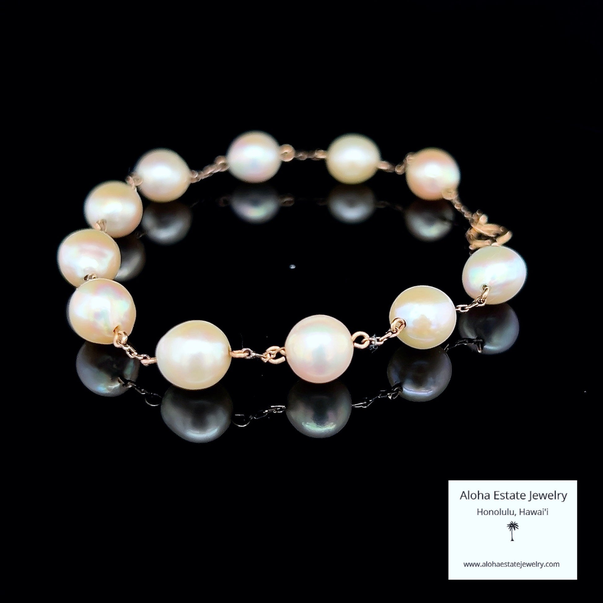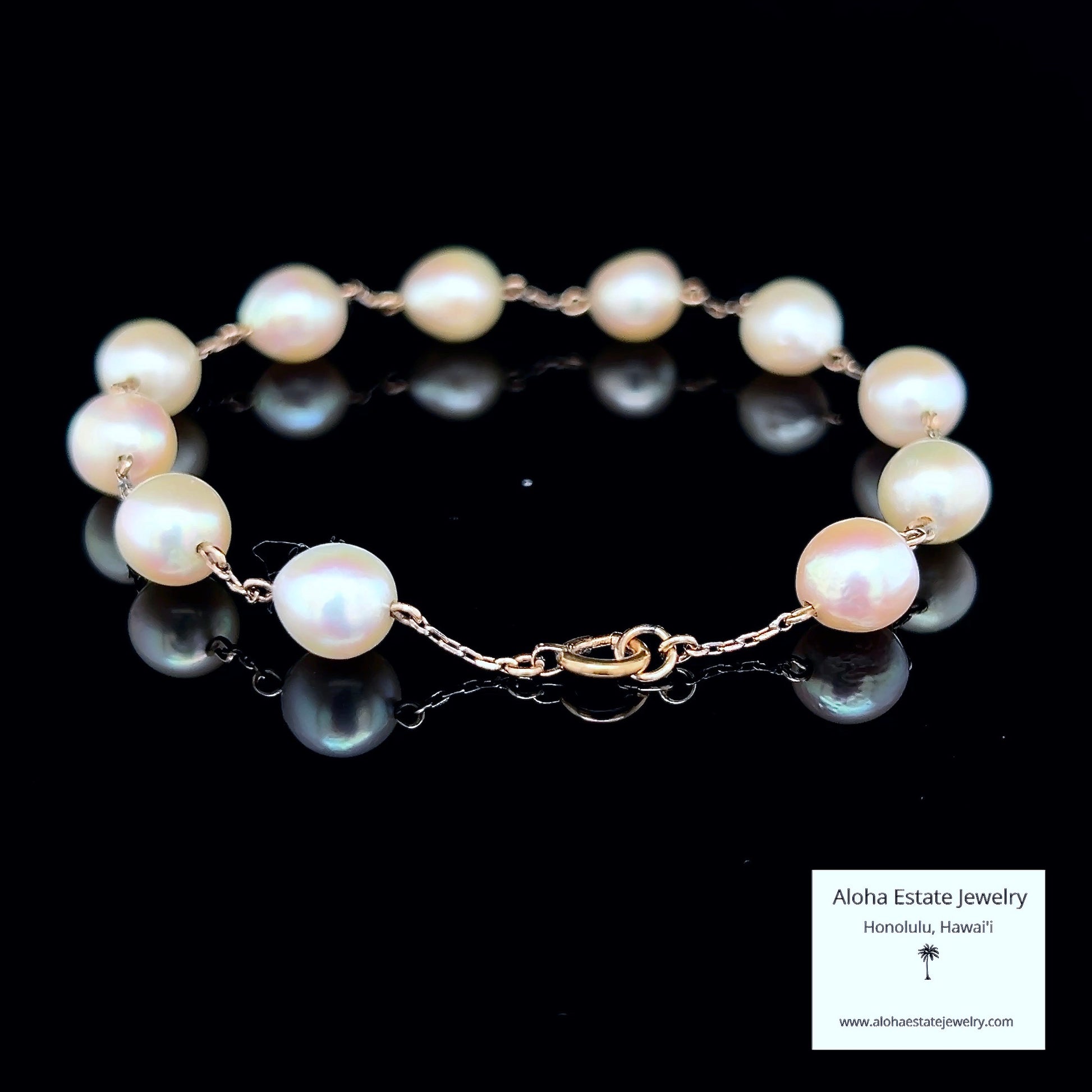 Experience the understated elegance of this vintage station bracelet, where eleven matched Akoya pearls rest gracefully between 18k yellow gold links. Each lustrous pearl, averaging large-sized pearls of 7mm in diameter, showcases the subtle complexity of natural gems—predominantly white with delicate pink, red, and silver undertones that shift with light.Â