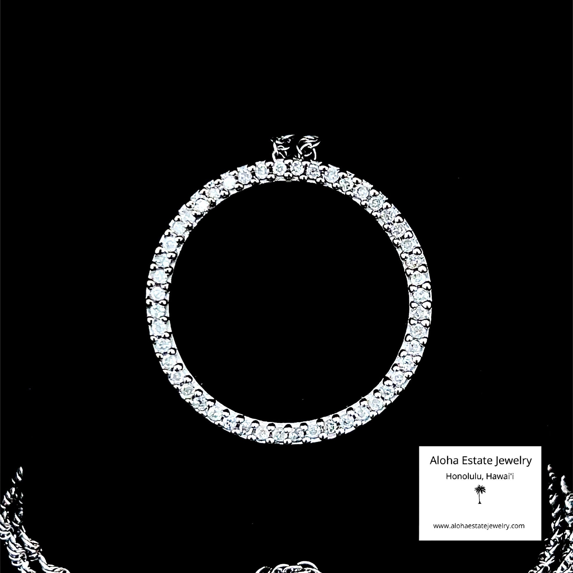 An elegant mid-century pendant that captures timeless appeal. Crafted in 10K white gold, this circular design showcases a stunning arrangement of diamonds with brilliant sparkle across its 20mm face.Β