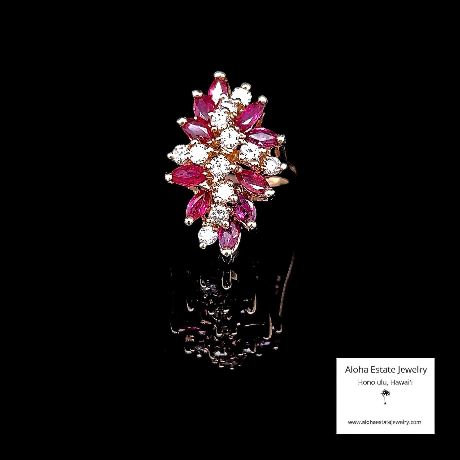 A striking mid-1960s vintage cluster ring in 14k showcasing the refined taste of its maker. Ten marquise-cut Myanmar Red Spinels (1.5-carats) frame twelve round brilliant diamonds (0.5-carat), each stone selected for exceptional clarity and sparkle.