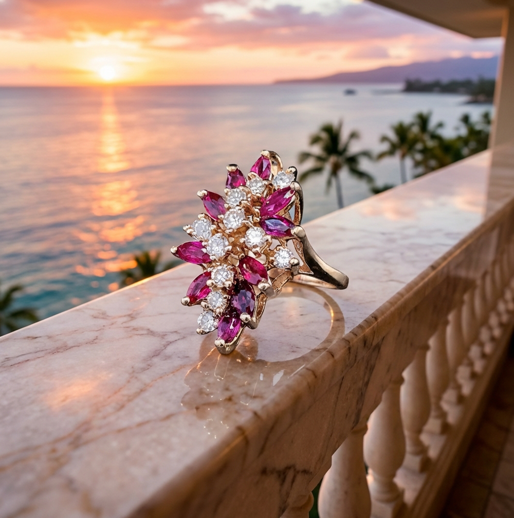 Vintage 2-Carats Diamonds and Red Spinel Cluster Ring