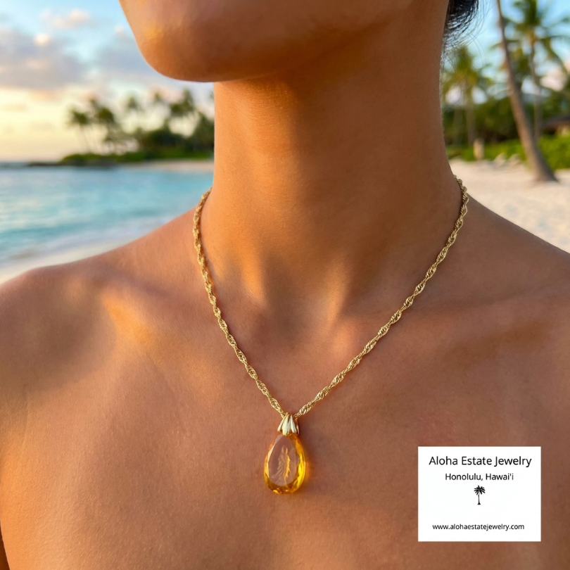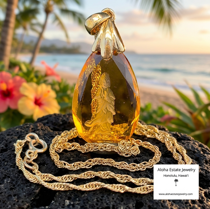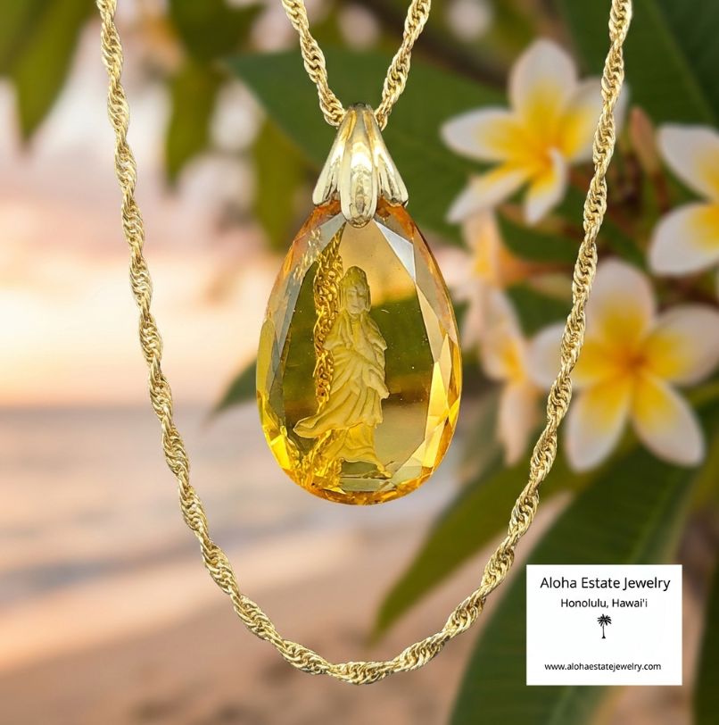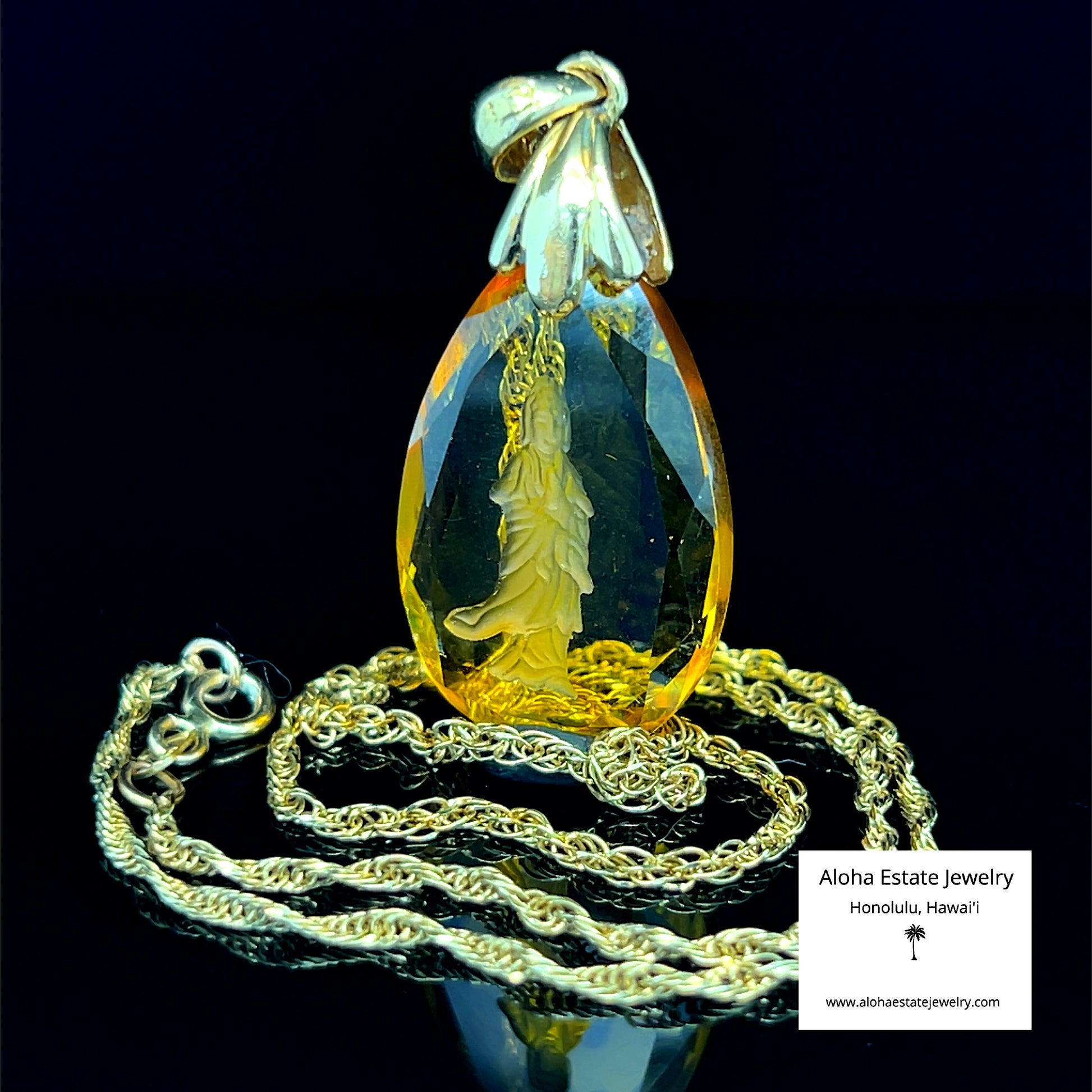 This citrine pendant features a hand-carved intaglio of Quan Yin, the bodhisattva of compassion, rendered in stunning detail across a pear-cut golden stone.Â