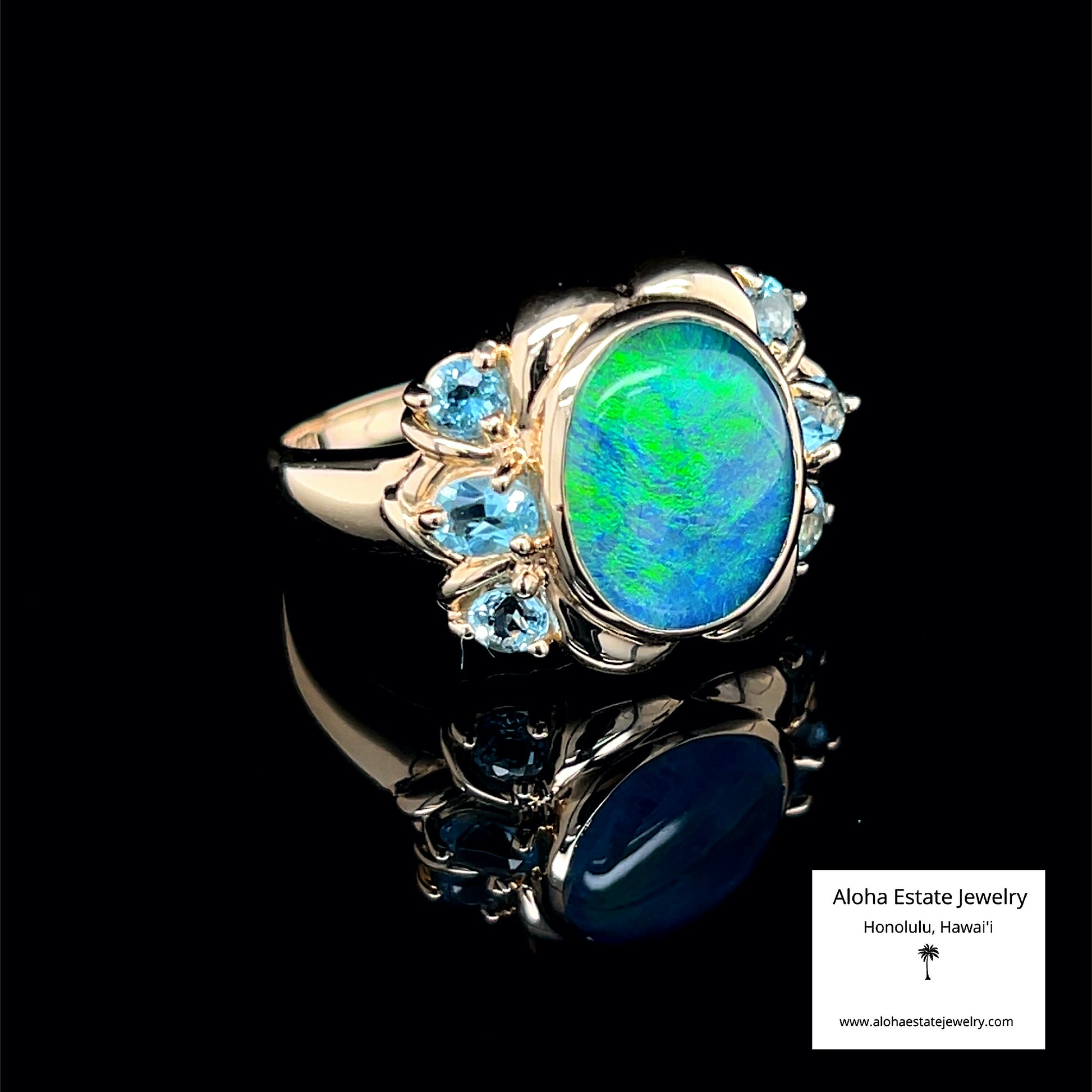 A stunning 1980s Australian black opal doublet ring acquired in Sydney and now fresh from an Oʻahu, Hawaiʻi estate – pure tropical-meets-down-under glamour.